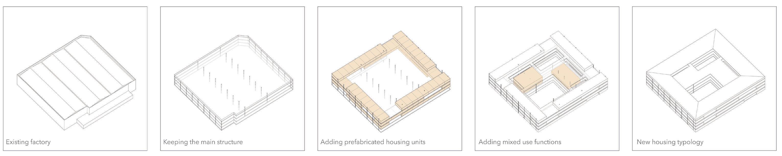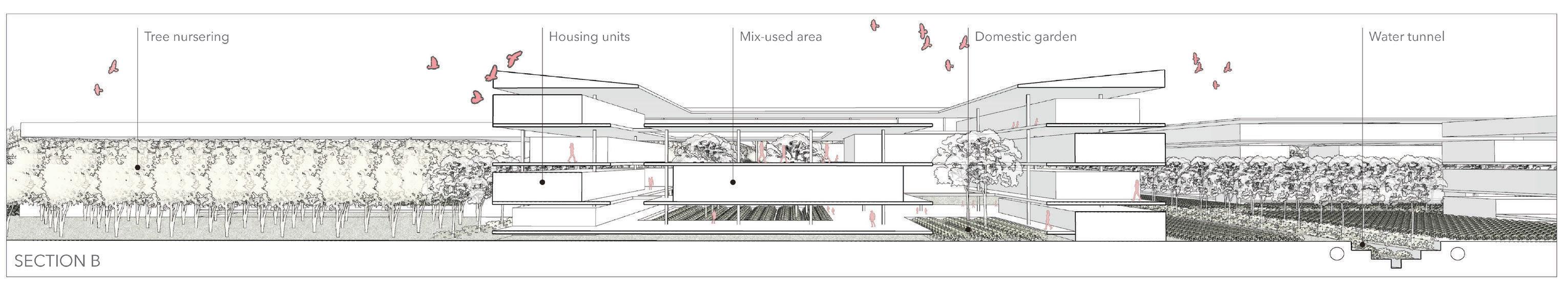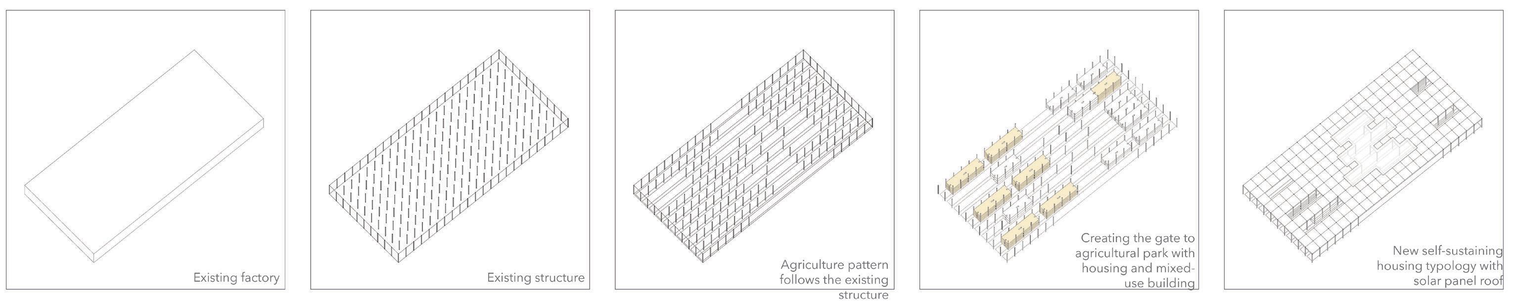 The vision for the industrial area of Montcada includes a wastewater collection pond, tree nursering, wetland tree nursering landscape, reclaimed riverbank, mixed-use area, a domestic garden, a water tunnel, and a new housing typolo gy constructed using the existing main structure of the factories. One of the pro posals is to convert the supermarket storage facility into a new urban fabric that becomes a link between Pla De Reixac and Turo De Montcada. The new facil ities include self-sustaining housing typology with solar panel rooftops, social spaces, a water collection system, research and agricultural workshop facilities, greenhouses, and community gardens. The research questions are as follows: Can a productive landscape erase the barriers that divide the main landscape flow and make Montcada a healthier ecological mosaic? Can structuring the industrial pockets with water and wetland systems relieve the pressures from industrial activ ities and strengthen the productive landscape? How can the new typology of urban agro-housing be adopted to interact with the surrounding productive landscape and further strengthen the system?