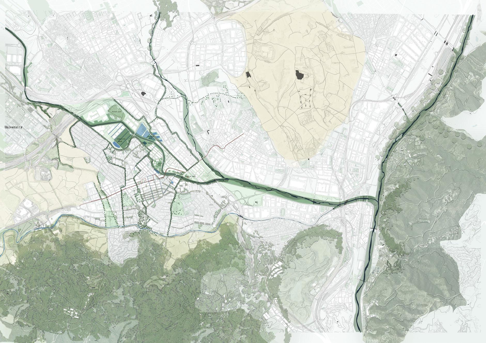 Montcada i Reixac is a town of 36,794 inhabitants where the Ripoll River meets the Besos River. It has a great complexity due to different factors, including the cross ing of heavy infrastructures like a highway, a national road and a railway that create a division in the town along with dangerous crossings, noise and biodiversity dis continuity. It results in pockets of different urban tissues hardly connected. Despite this, Montcada has a privileged location around the meeting point between two rivers, embraced by the Sierra de Marina and Collserola, and bordering the Pla de Reixac, places of great ecological value but which are threatened. Montcada has the potential to become a city that clearly establishes a new relationship with the landscape, but also, due to its intertwining situation between different ecologies, it can be the place that revalues, enhances and restores damaged and endangered natures. And becomes a benchmark for the Vallesana region, in the development of a balanced coexistence between nature and human settlements.