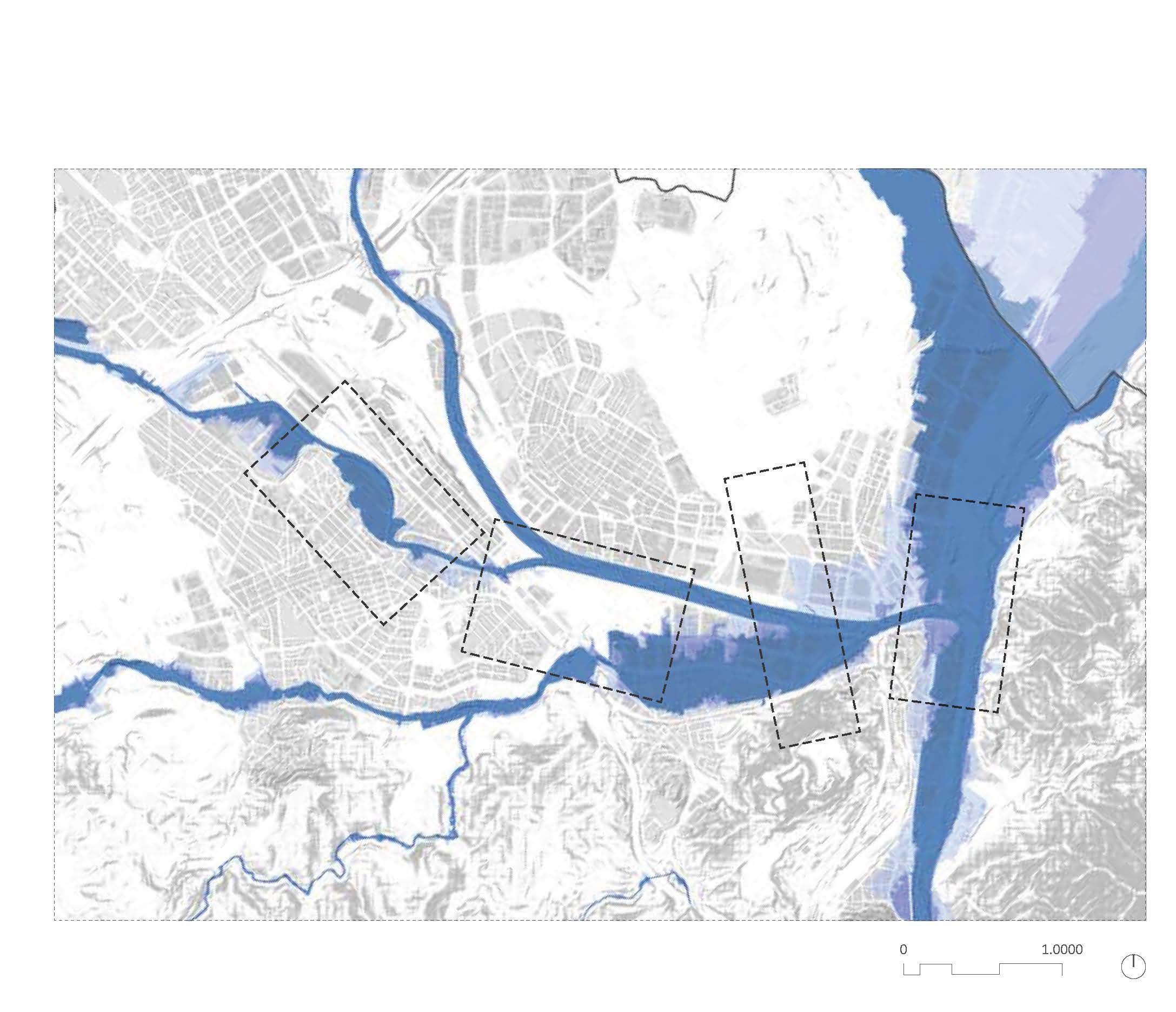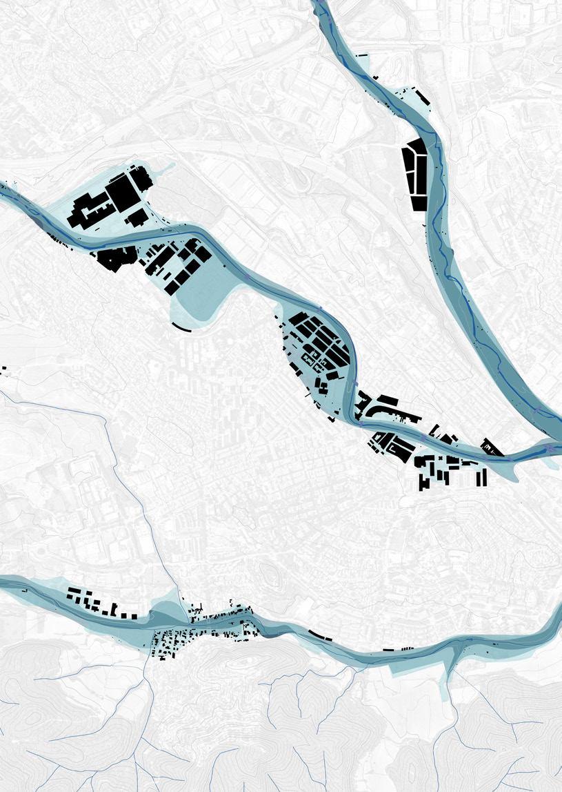 In order to define our design intervention, we analysed some important figurest hat were a base in our design. These aslso helped us in formulating our research questions and strategies on how to intervene. Our main strategy was centered on renaturalising the landscape by defing the wet and dry areas. This would help guide the city in regards to areas that are safe forhousing, areas that can be used for the public and give more space for the river to flow naturally. We also used the histor ical river channel as a main water collection through the city and also identifying inbetween plazas that can be use as collection points for the water that is then used for irrigating the green spaces or channeled to the riu sec.
