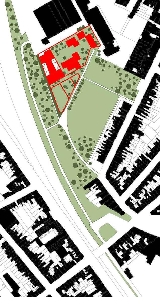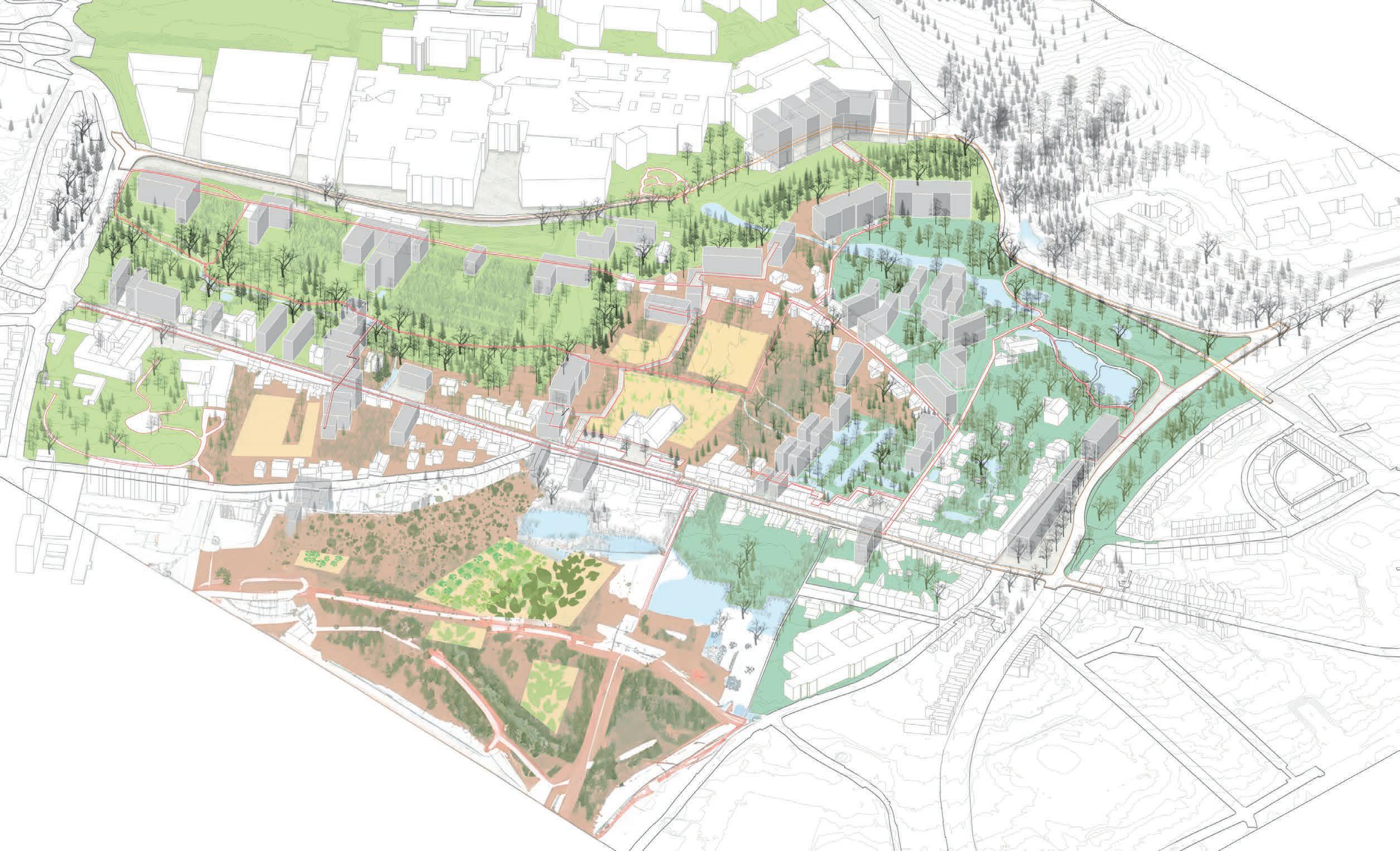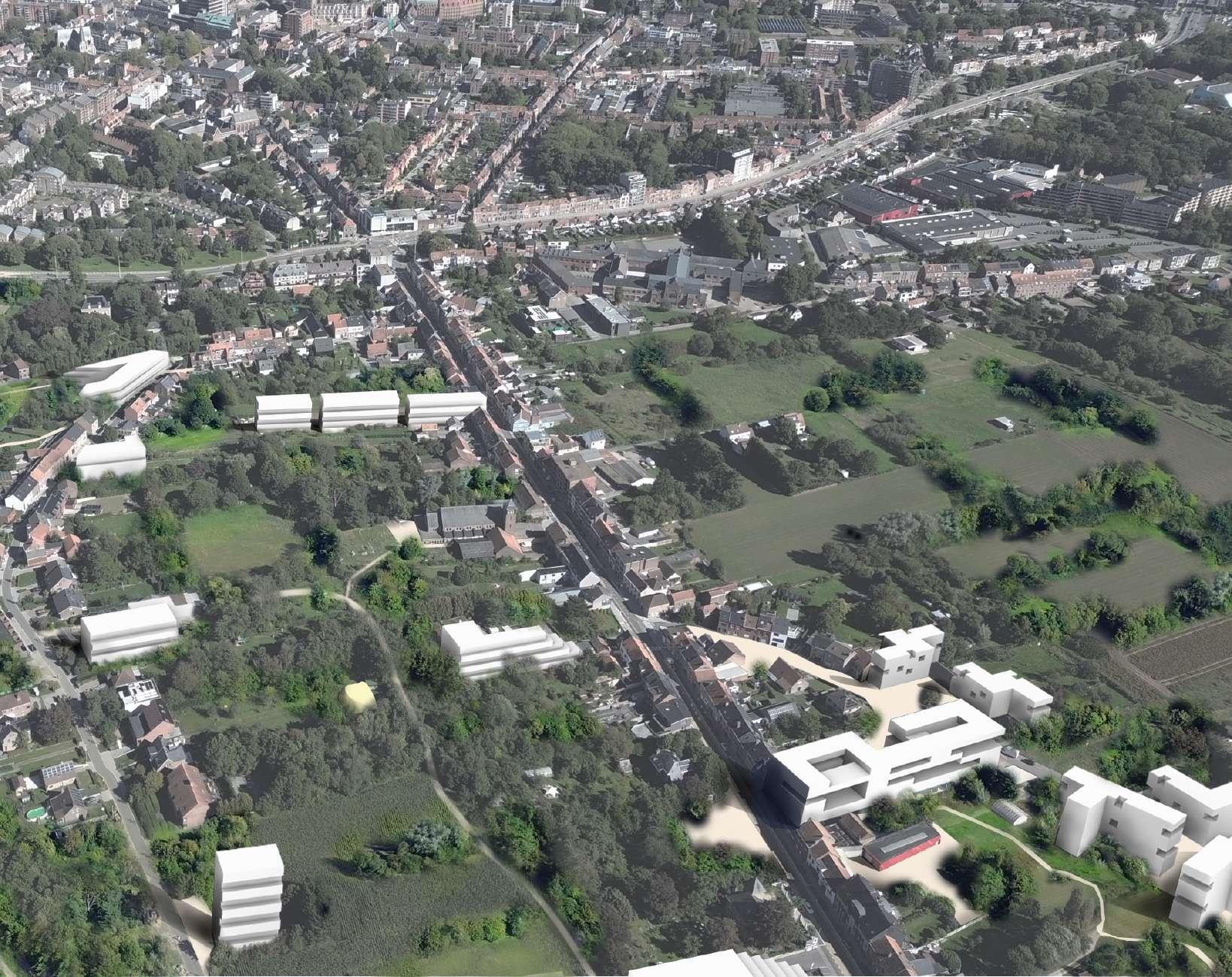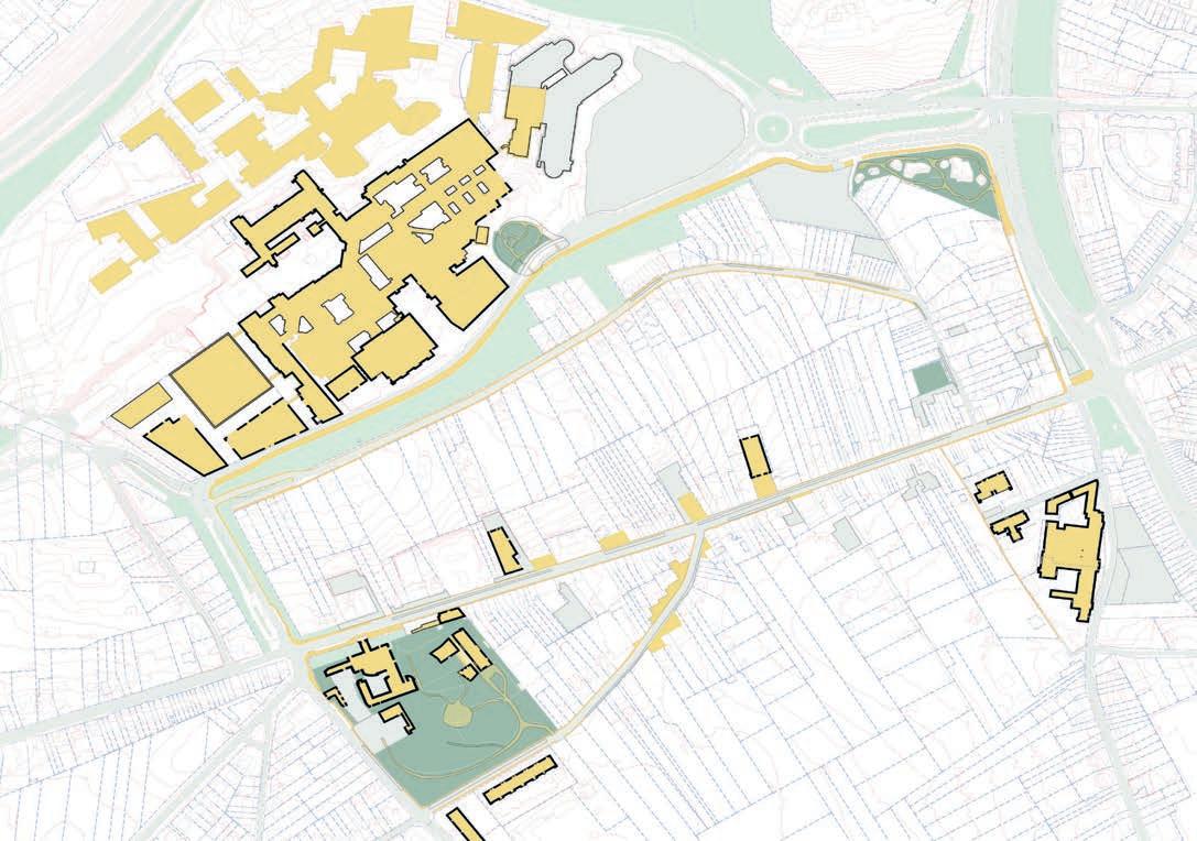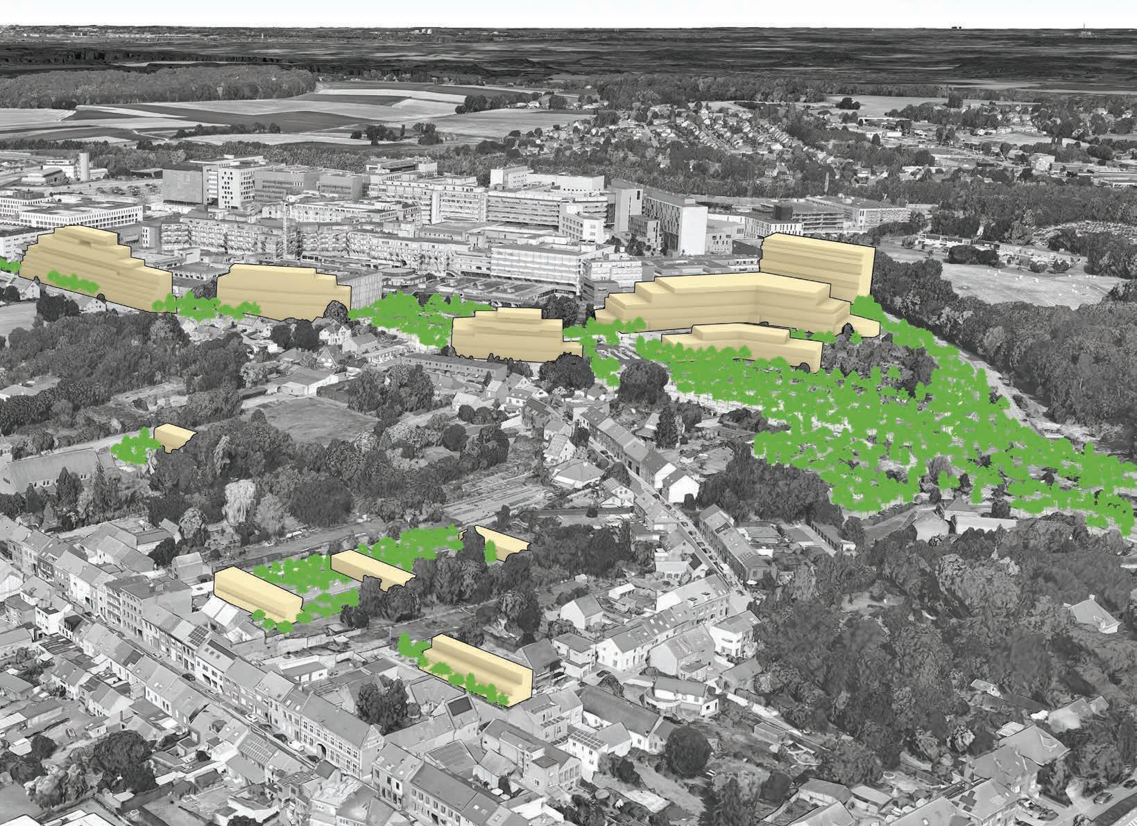 The site is comprised of fragments of urban fabrics on the western side (Witness hills) of Leuven, squeezed between the highway and ‘vesten’ (medieval earthworks) landscape (that was turned into a ring road). Since the 1950s, the area has become a dumping ground for larger institutions (university campus, university hospital, music academy, bank headquarters, big retail, etc.). The area is, in general, overinfrastructured (including large parking lots).