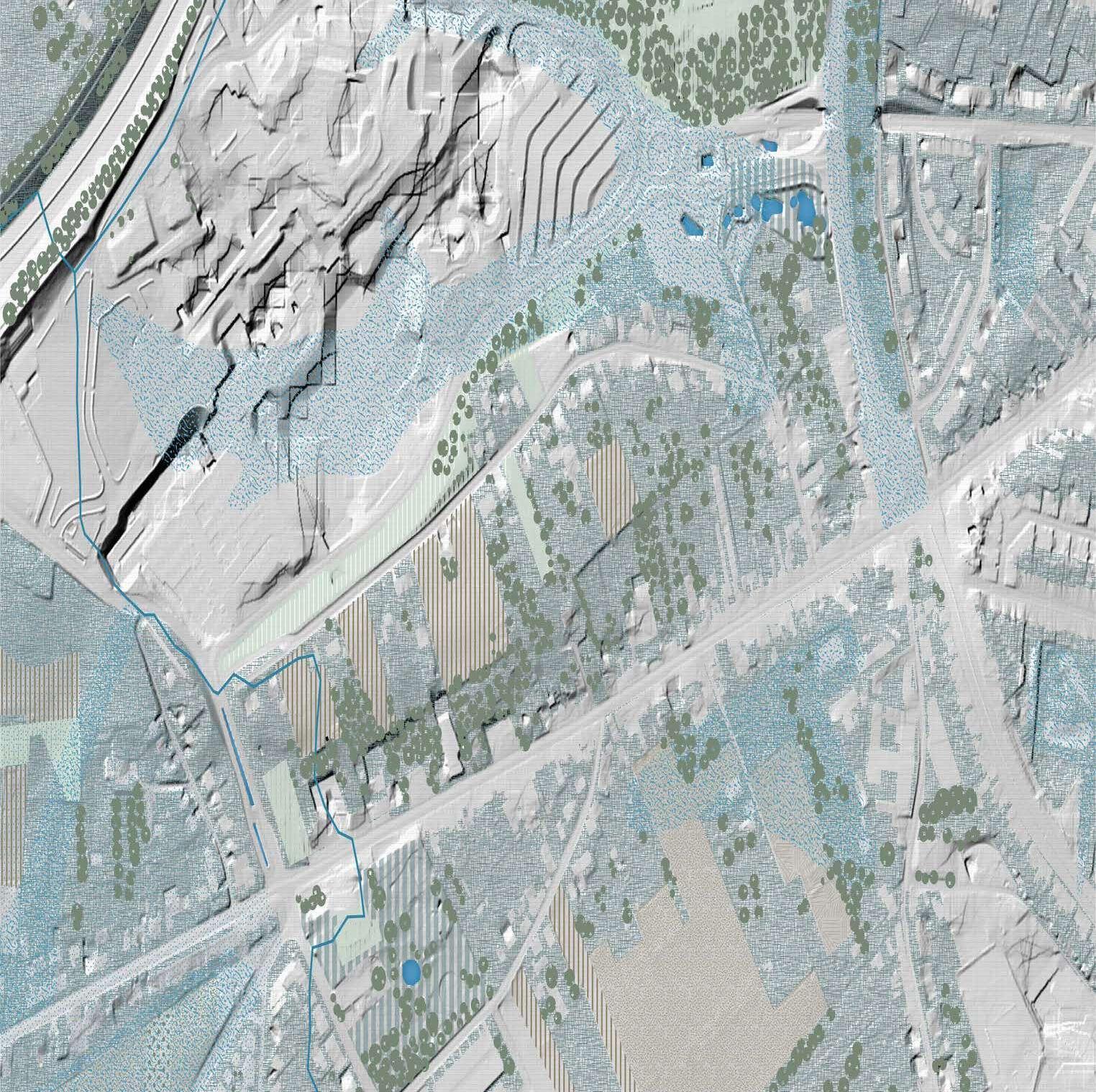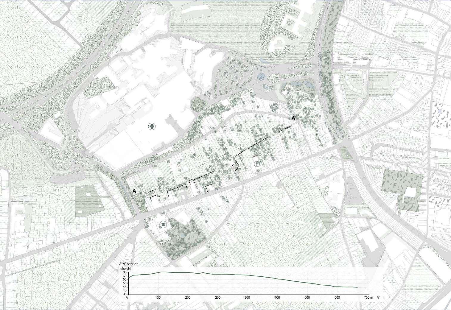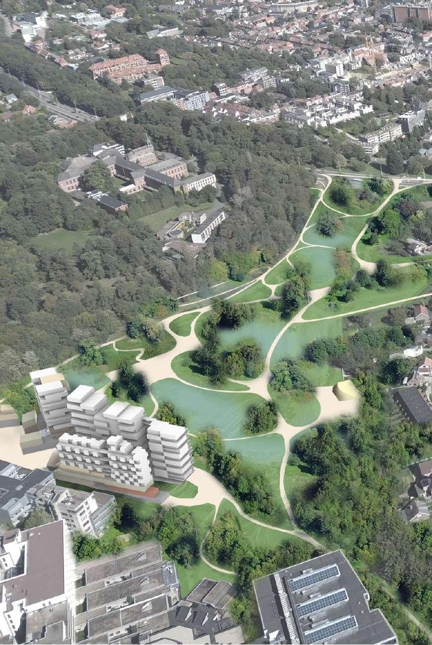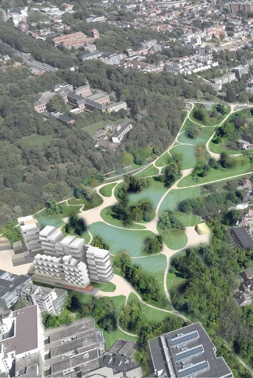 The steep topographical gesture between Tervuursesteenweg and the hospital is occupied by significantly under-occupied plots, framed by the Terbanck Institute and the entrance parking of the hospital.