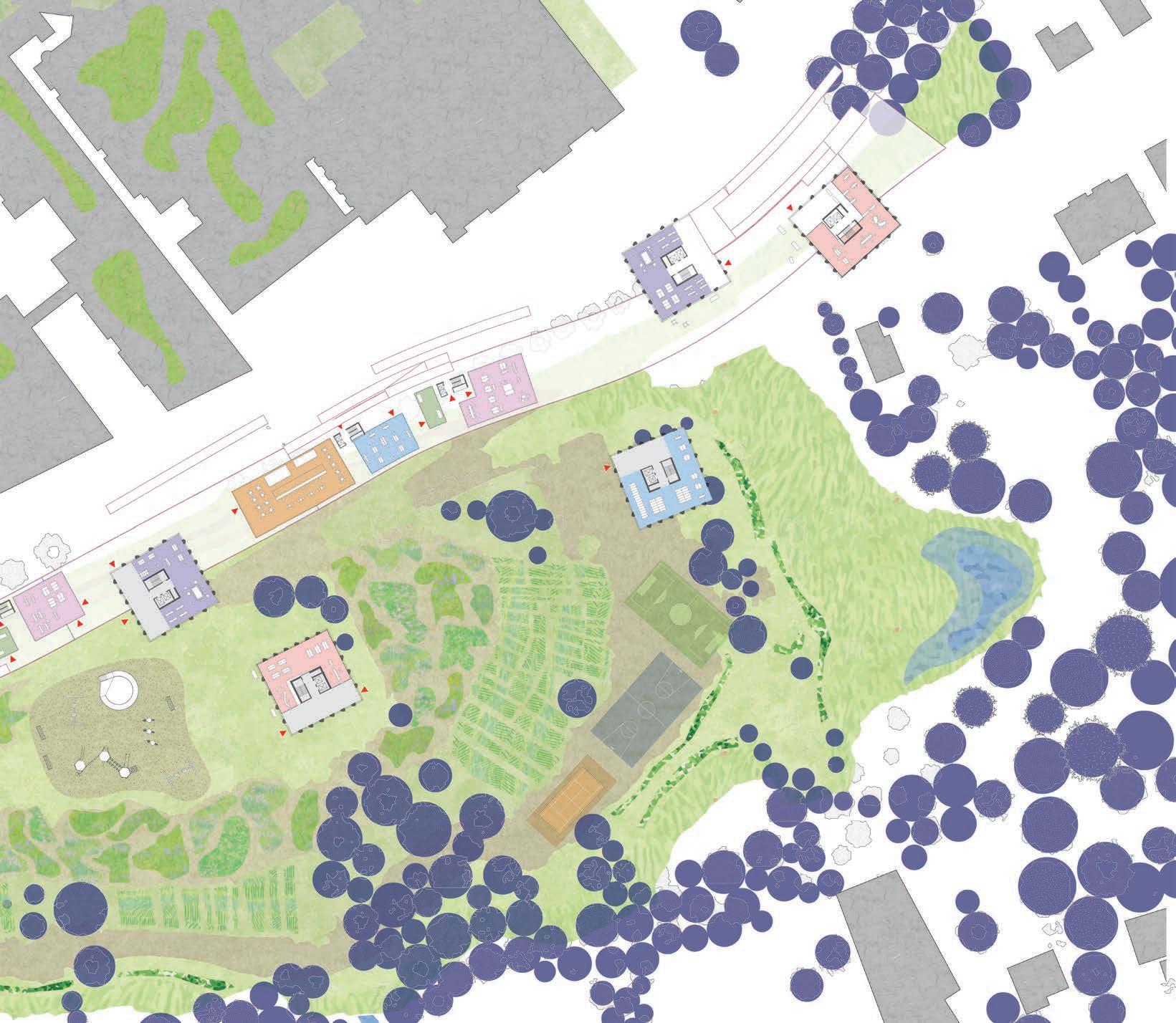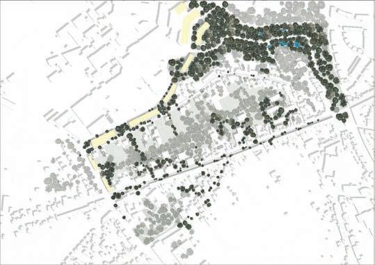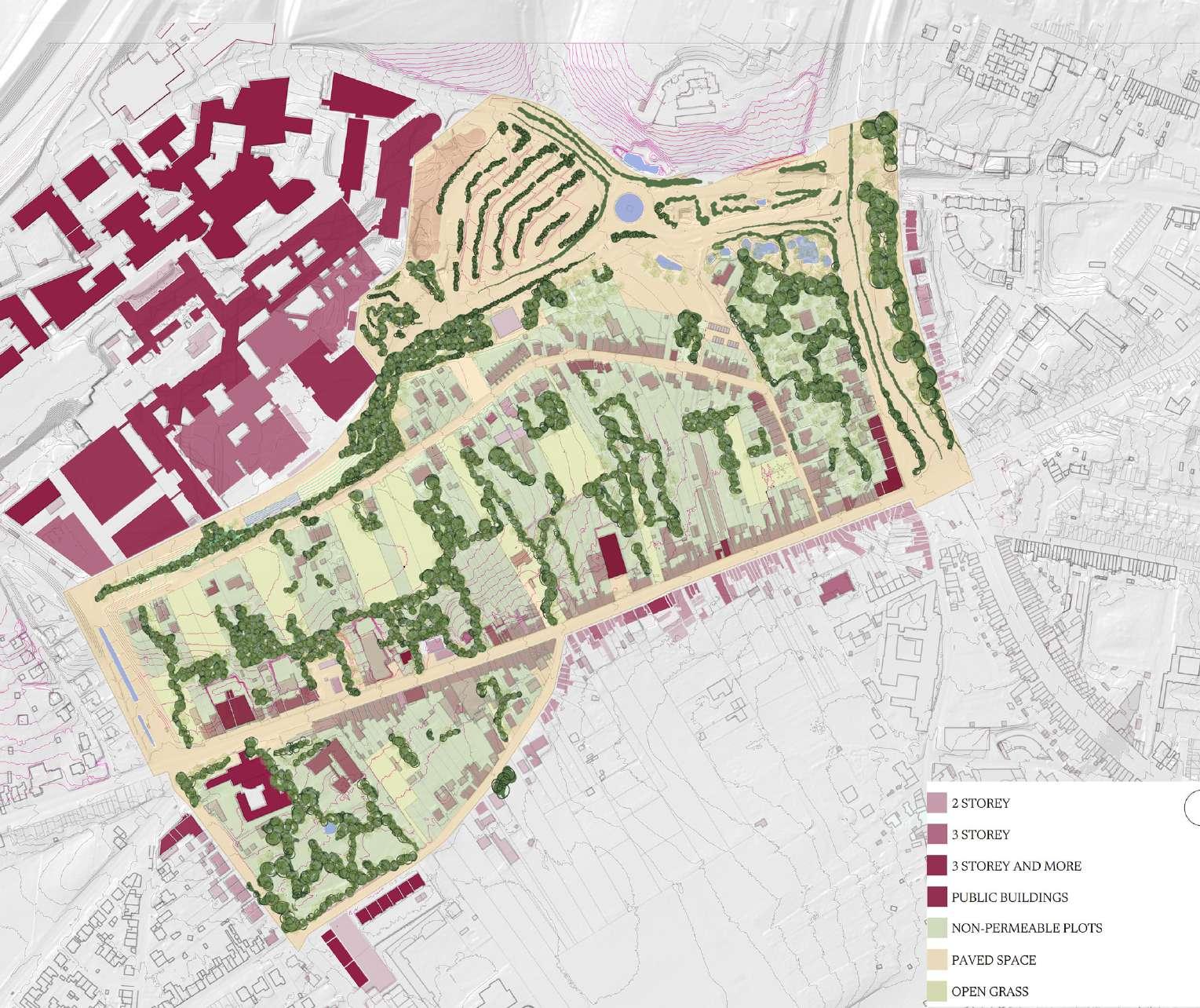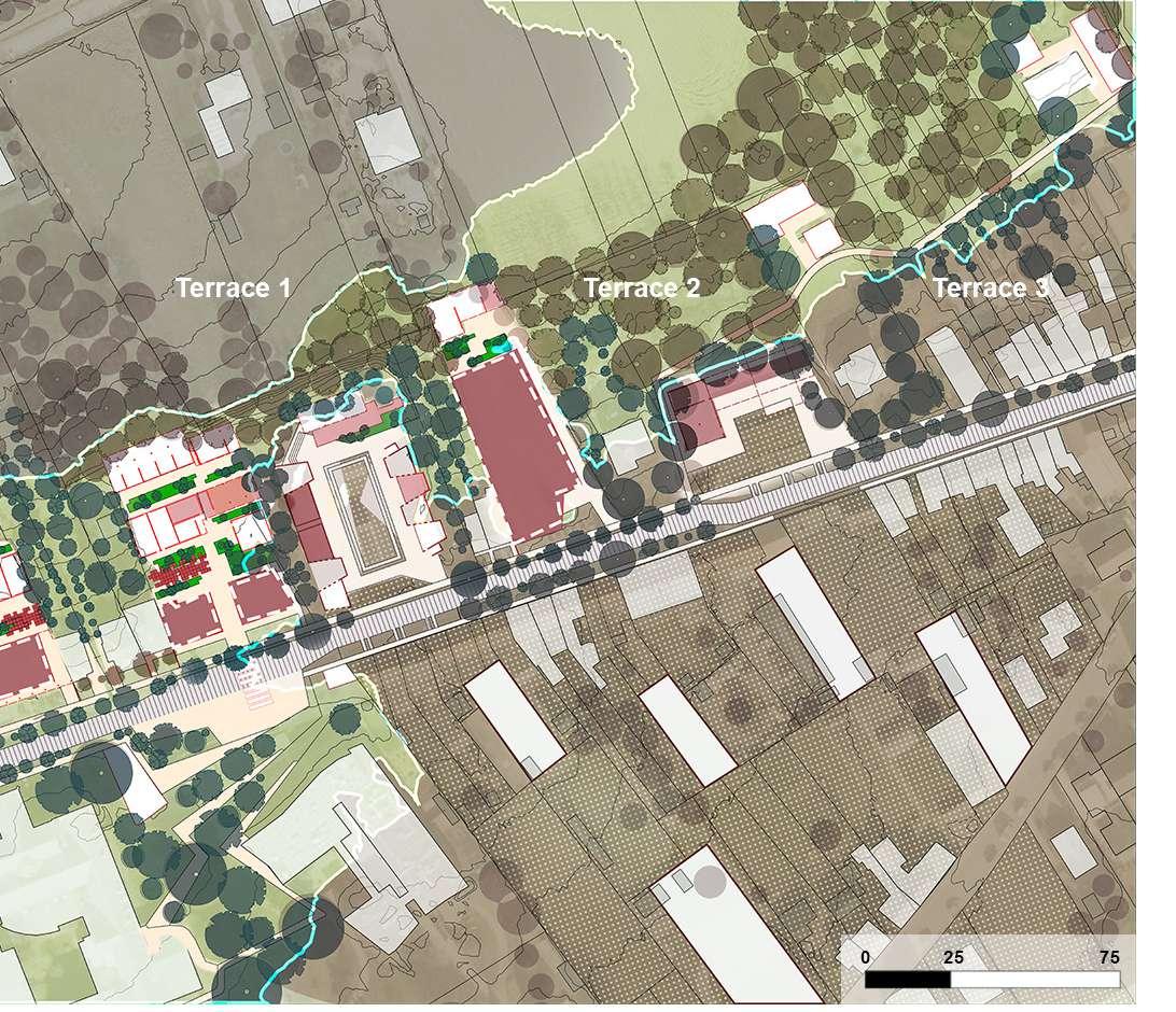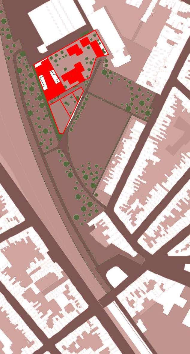 The steep topographical gesture between Tervuursesteenweg and the hospital is occupied by significantly under-occupied plots, framed by the Terbanck Institute and the entrance parking of the hospital.