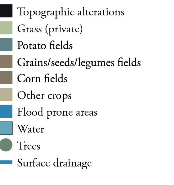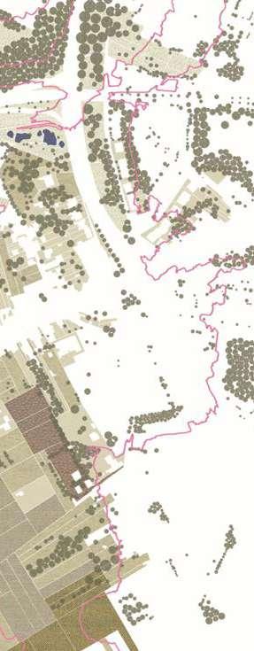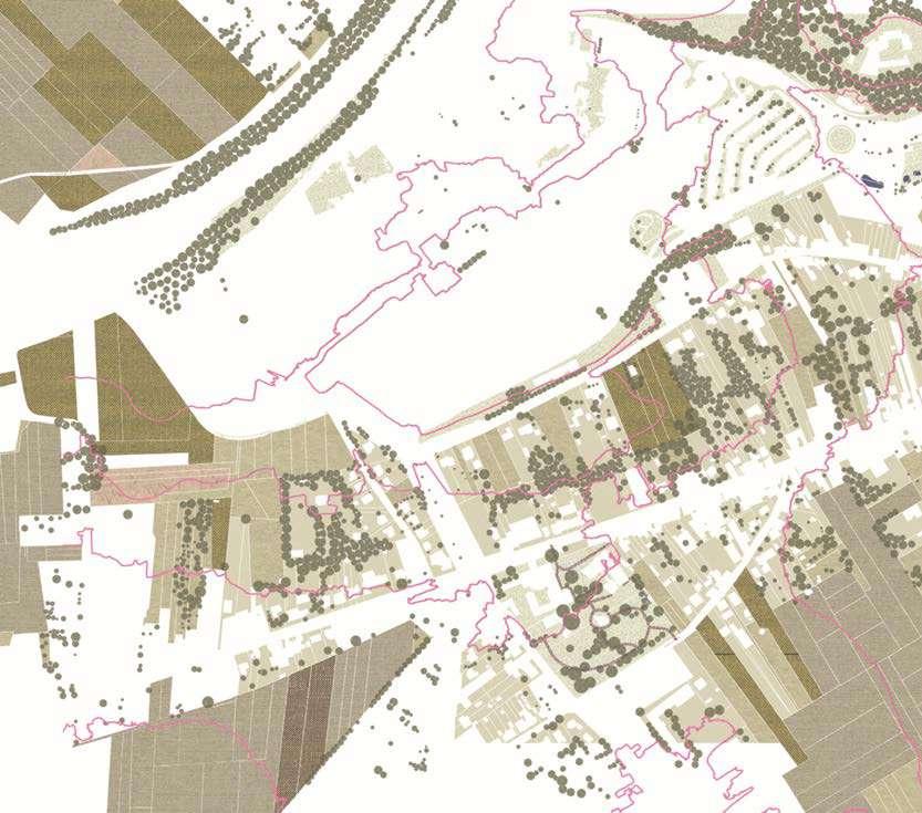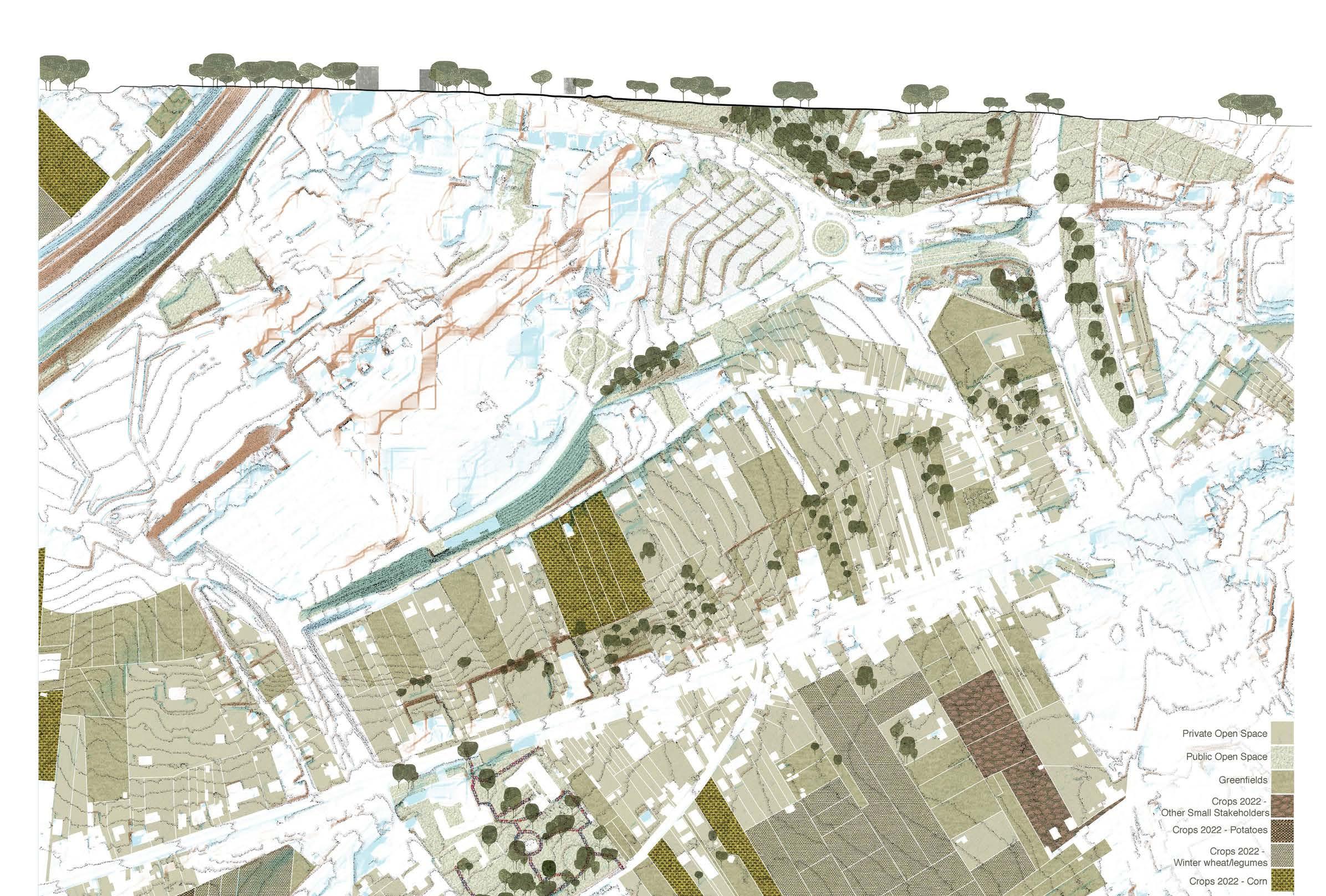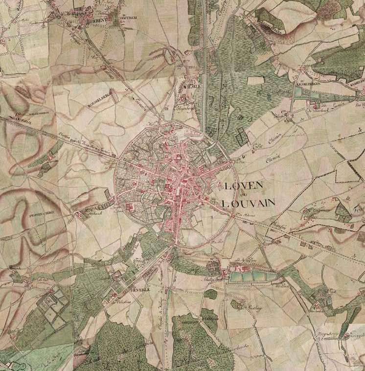 The city walls of Leuven mark a strong new artificial topography around the city. The Ferraris map of 1777 shows the clear distinction between the inner city development and the wide agricultural landscape beyond the walls. The flanks of the witness hills on the west side of the city form a strong agricultural landscape within the city walls with fields and vineyards. The steep slopes in this area explain the hesitant urban growth.
