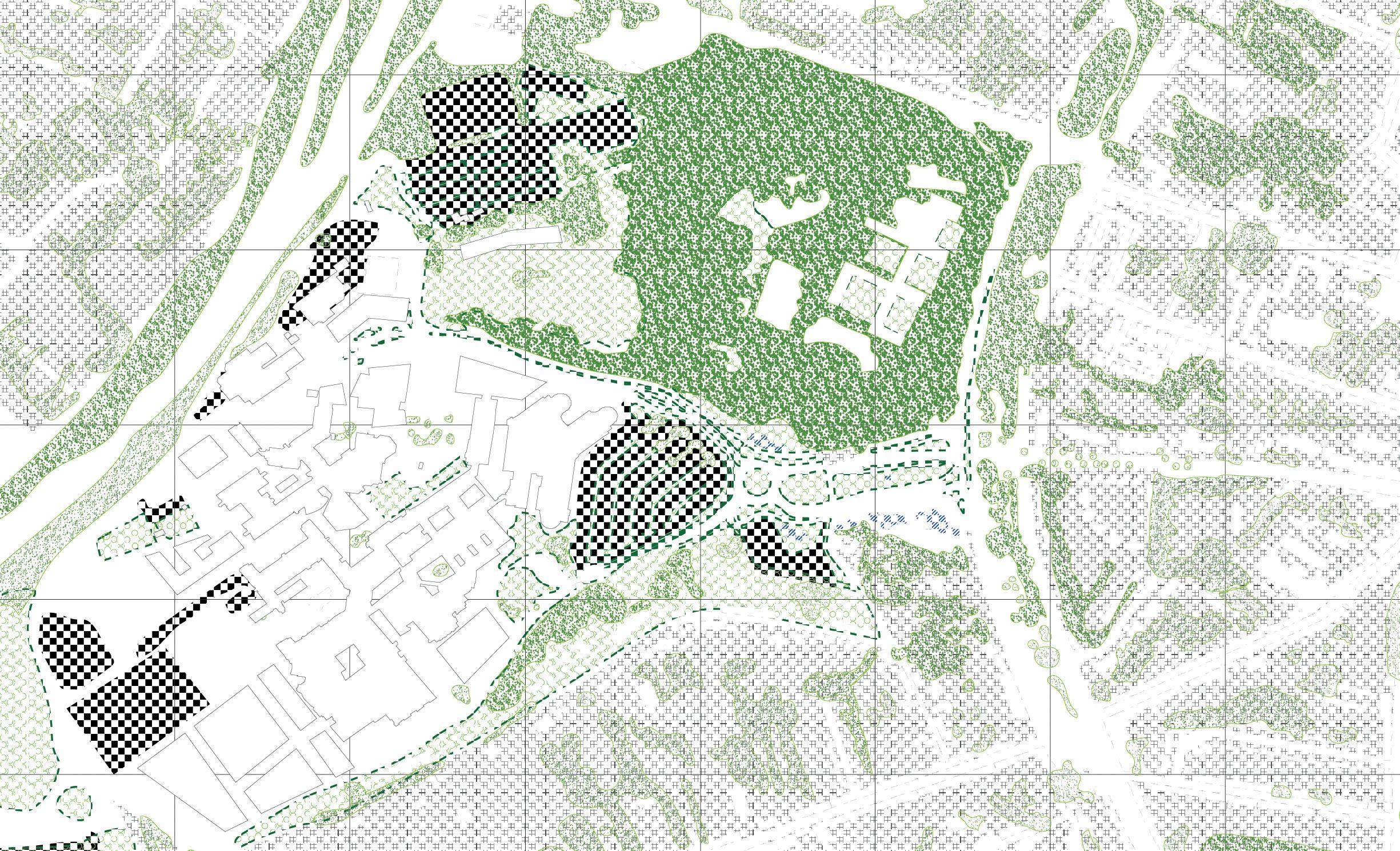 The site is comprised of fragments of urban fabrics on the western side (Witness hills) of Leuven, squeezed between the highway and ‘vesten’ (medieval earthworks) landscape (that was turned into a ring road). Since the 1950s, the area has become a dumping ground for larger institutions (university campus, university hospital, music academy, bank headquarters, big retail, etc.). The area is, in general, overinfrastructured (including large parking lots).