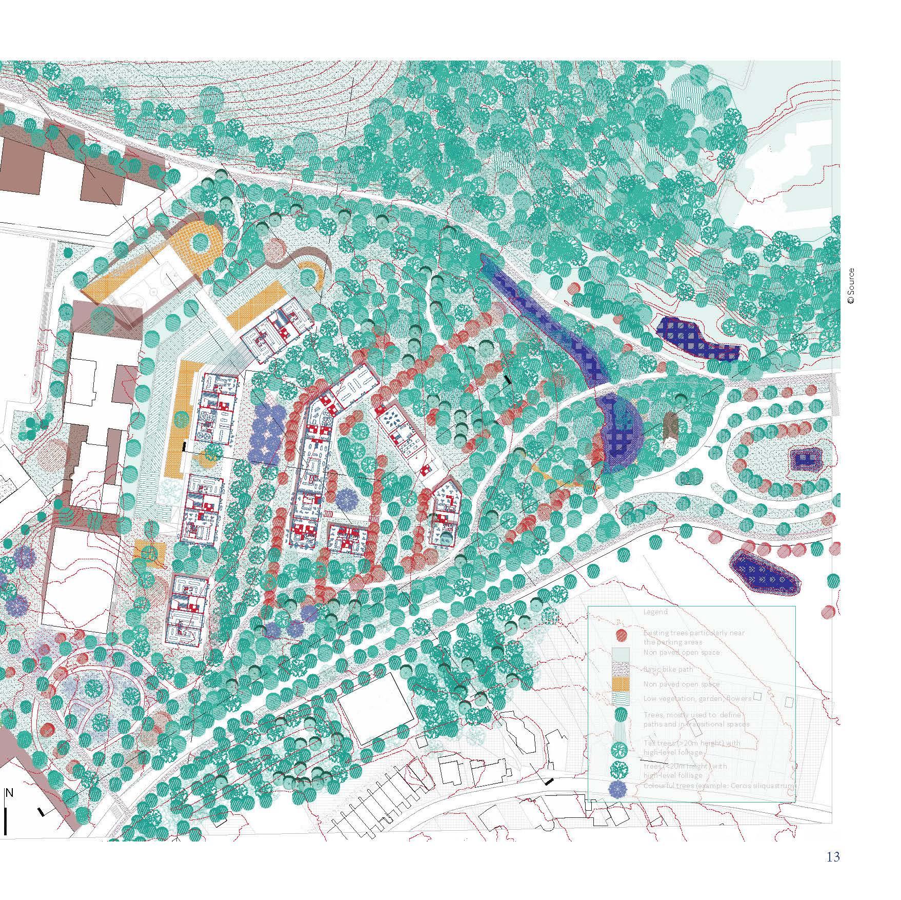 The high-density complex squeezes out public space. Large public lawns are hidden behind trees. And spaces scattered around the buildings make lingering uncomfortable. High-density buildings are clustered on the valley floor, ripping up the public space. The hillside, on the other hand, is empty and pleasant. The connection between the two is missing.