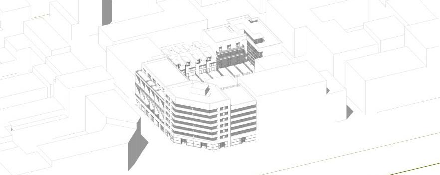 For each site, the design should aim for a density with a Floor Area Ratio of minimum 2.0 in relation to the existing impervious surfaces on site (parking, roads and buildings)