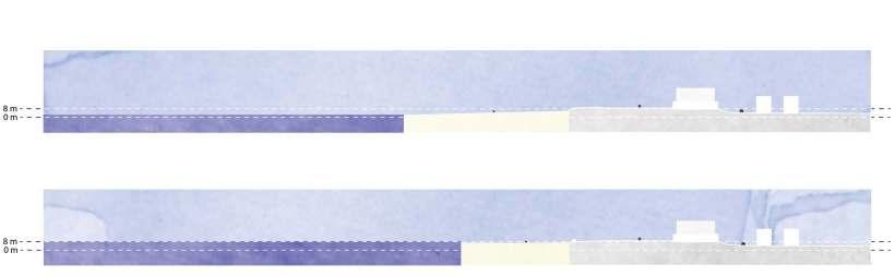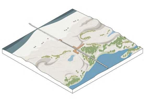 The vision for the end of the century is to restore and link the unique landscapes that exist: dune, polder and tidal. The extension of the dunes is proposed through the return of natural space and the interconnection of the existing dunes. While in the polders, the introduction of a series of ponds is envisioned in order to provide space for flooding, which together with the extension of the tidal landscape seek to respond to rising sea levels. With the ultimate goal of establishing a permanent settlement in the area.