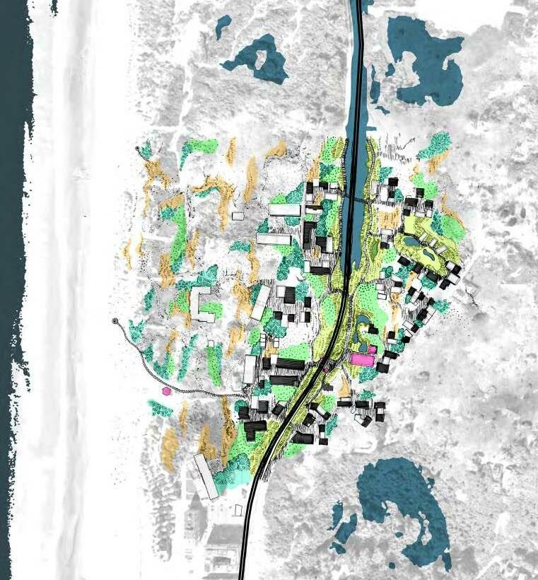 The main non urbanized area of dunes in the site is the Golf course, is envisioned to transform this area in to a dune forest park that can accommodate the increasement of rain water in the future, but also seeking to democratise the dunes nowadays mainly cover by private spaces of temporary uses, like second houses and tourism infrastructure.