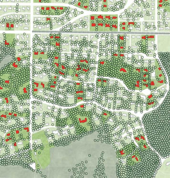 In response to the Dune Decree, the proposal considers working with the urban footprint of the existing buildings.Throughtheopeningoftheplots,theaimistointroducetheduneforestintotheneighborhood. Doing this in phases will result in a growing open community forest and a denser neighborhood.