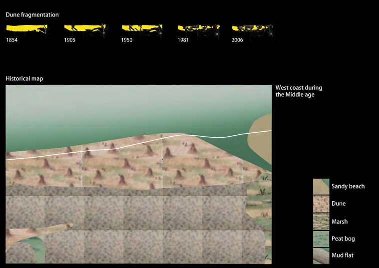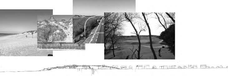 The wide dune system in the west of the coast is impres sive. It not only provides a natural coastal defense, but has become an attraction for urbanization. The old town centers are positioned at the edge of polder and dunes, and a new ‘badplaats’ was developed directly at the coast. The qualities of the in-between dune landscape have re sulted in a piecemeal fragmentation of this exceptional environment: an urban mesh has fixed the dunes. A de fragmentation program has been initiated to allow the reconnection of different nature areas. What if we take this defragmentation to its essence! What do we need to realize a coexistence of a dynamic dune landscape with a renewed urban component?