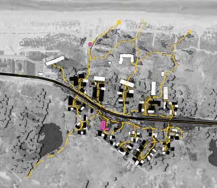 This principle of remodelling houses and creating public gardens will continue to grow in 2100. In order to create a more densely populated neighbourhood without losing the forest figure and to transform the separated community that exists today in 2021 into a new communal forest.