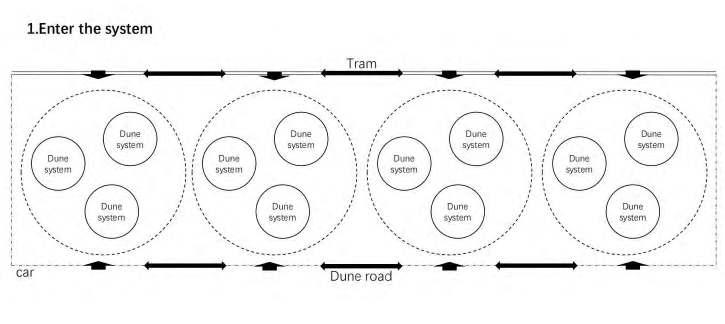 The extension of the tram is frame in the existing condition of the tramline that connects a major part of the coastal settlements of the country. The extension considers the addition of 4 new stations in one way line and in a form of a loop, to minimize the impact in the existing road system by connecting 4 different areas of the settlements: 1. the old consolidated fabric, 2. the in-between of the polder and tidal landscape, 3. the access to the dune forest area and 4. the villas in the Zoute.