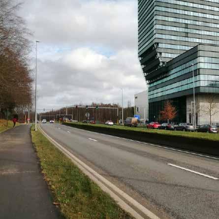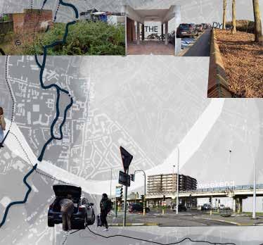 • transition to a car-free university city means making place for other forms of mobility: eliminating and changing (car-)lanes. The valley should become accessible and movement in the valley should become smooth and abundant. Crossing the valley, however, (with cars, etc.) is not considered beneficial and should be limited to the absolute neces sary minimal. In this way, the valley can become the spine of the new (carless) urbanity. Crossing points (ring road, Brusselsestraat, etc. can be articulated as bridges across the valley