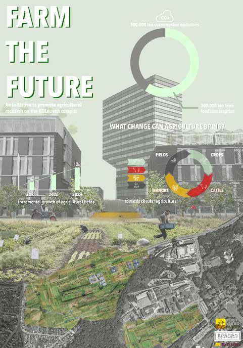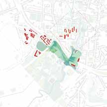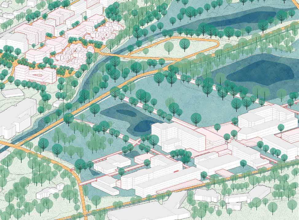 The first studio module investigates the Arenberg Park in Heverlee, home of a large university campus and links it to the inner-city university grounds. It fundamentally questions the Leuven campus model of the 1960s that created a mono-functional and exclusionary enclave and explores contemporary universitymodelsthatacknowledgetheintenseinteractionandintertwinement of universities and cities. The studio’s hypothesis is that sterile campuses can mutate into vibrant urban environments and that universities can imbue a unique form of urbanism into cities. It is understood that respecting heritage and restoring ecologies is high on the agenda, as well is the transition to carfree mobility. The Arenberg Park is seen as the first step-stone for the bikedominant transport mode in the Dijle Valley. Complex and mixed urban tissues are proposed on‘university land’(and other public land) on the slopes of the valley and the studio elaborates innovative development models that do not solely depend on the real estate market, but give way to shared economies, cooperatives, and commons. Greenfield development is banned. Land is recuperated from unnecessary parking, infrastructure, and restructured building tissue.