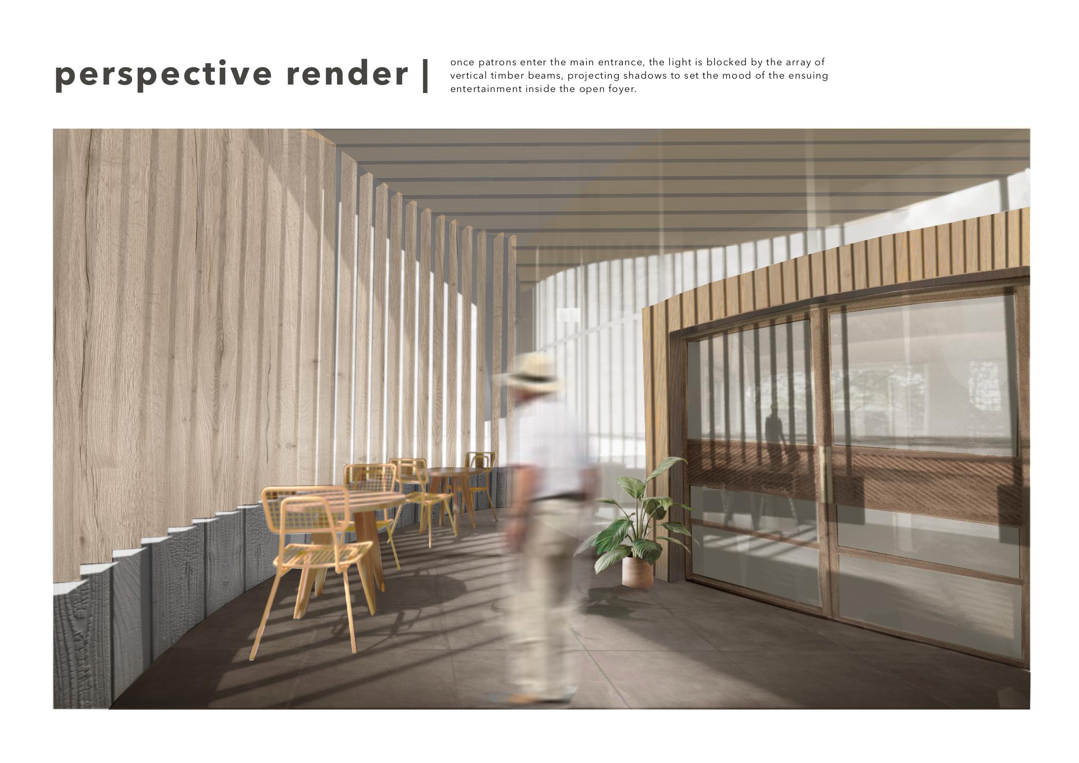 Timber Theatre Perspective Render | Once patrons enter the main entrance, the light is blocked by the array of vertical timber beams, projecting shadows to set the mood of the ensuing entertainment inside the open foyer.