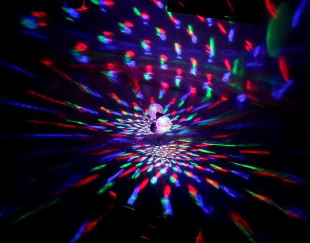 -Two rotating crystal disco balls, create amazing colorful light effect all around the room.