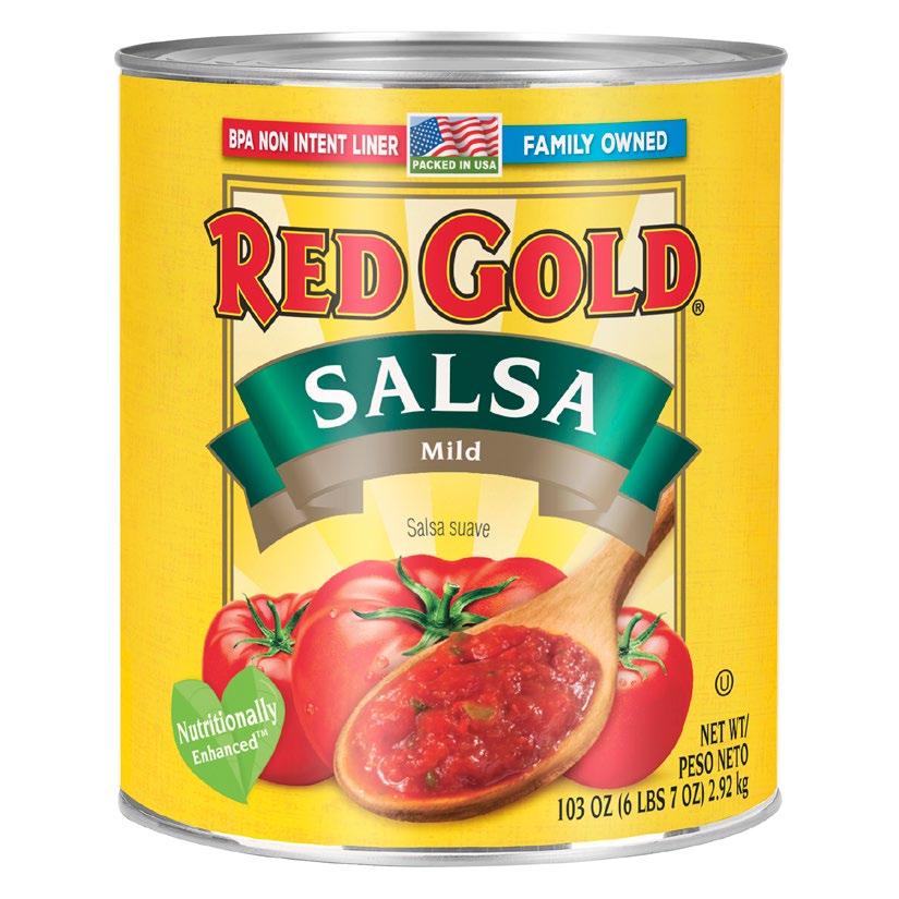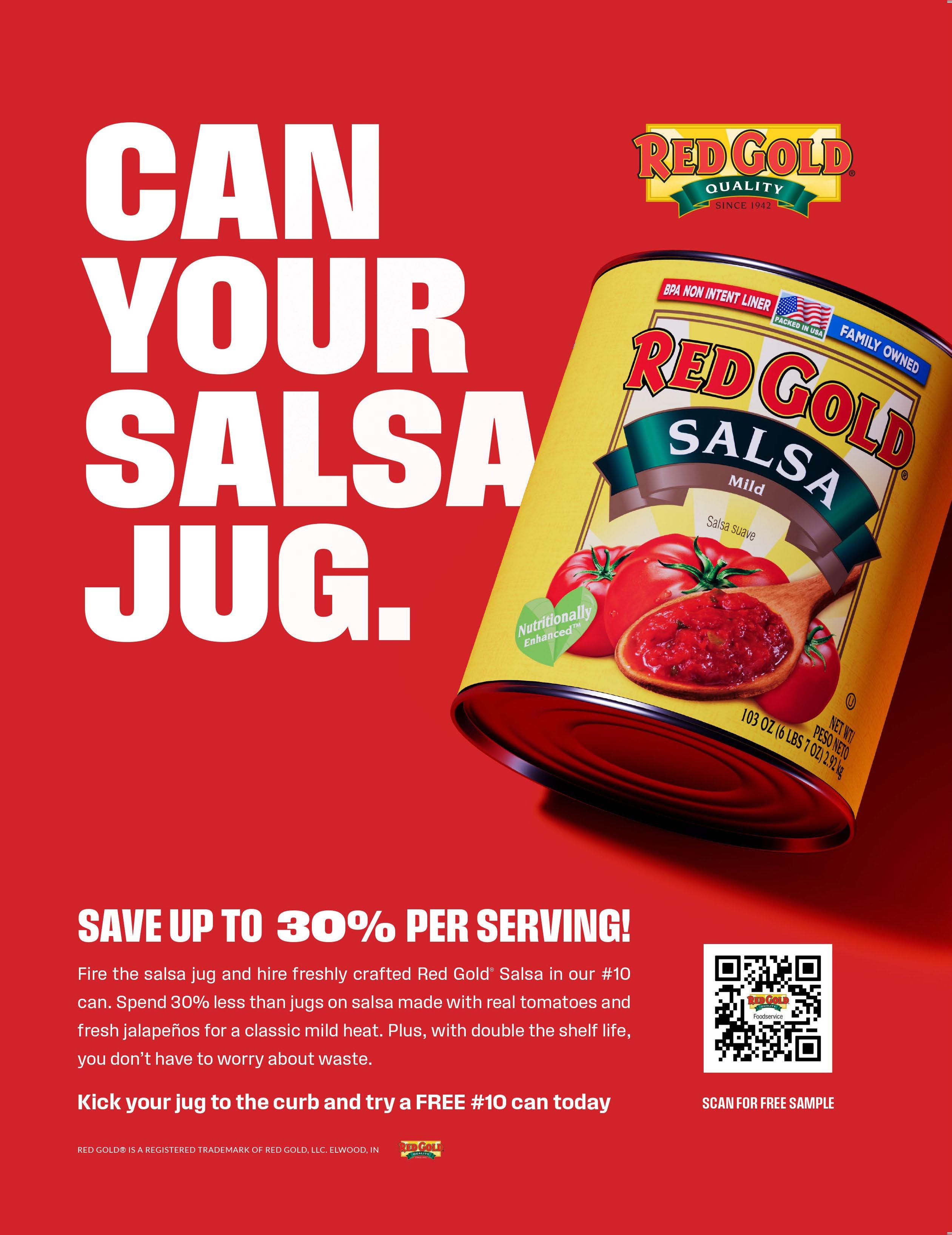 Red Gold Salsa. Save up to 30% per serving when you make the switch to Red Gold® Salsa in a #10 can vs. your plastic jug! Red Gold Salsa offers a tasty blend of tomatoes with traditional spices and mild heat from the jalapenos, onion and hints of garlic. It’s the easy way to save on your food costs by simply making the switch to Red Gold Salsa in a #10 can. Want a free sample? Visit redgoldtomatoes.com/ redgoldfoodservice/sample-requests to ask for your free sample now.