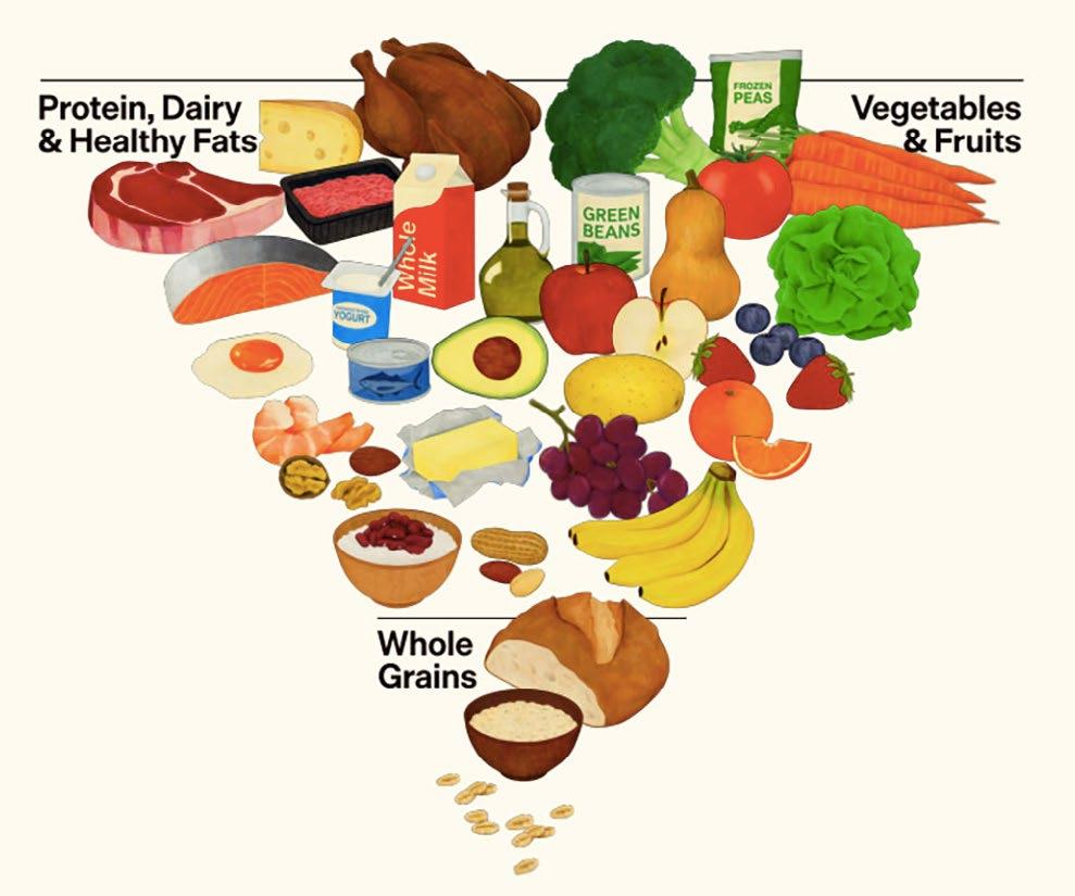 The new guidelines essentially turn the old food pyramid upside down. Now meat and other animal products, such as cheese and eggs, as well as whole vegetables, are highly recommend, while processed foods and refined grain products are discouraged.