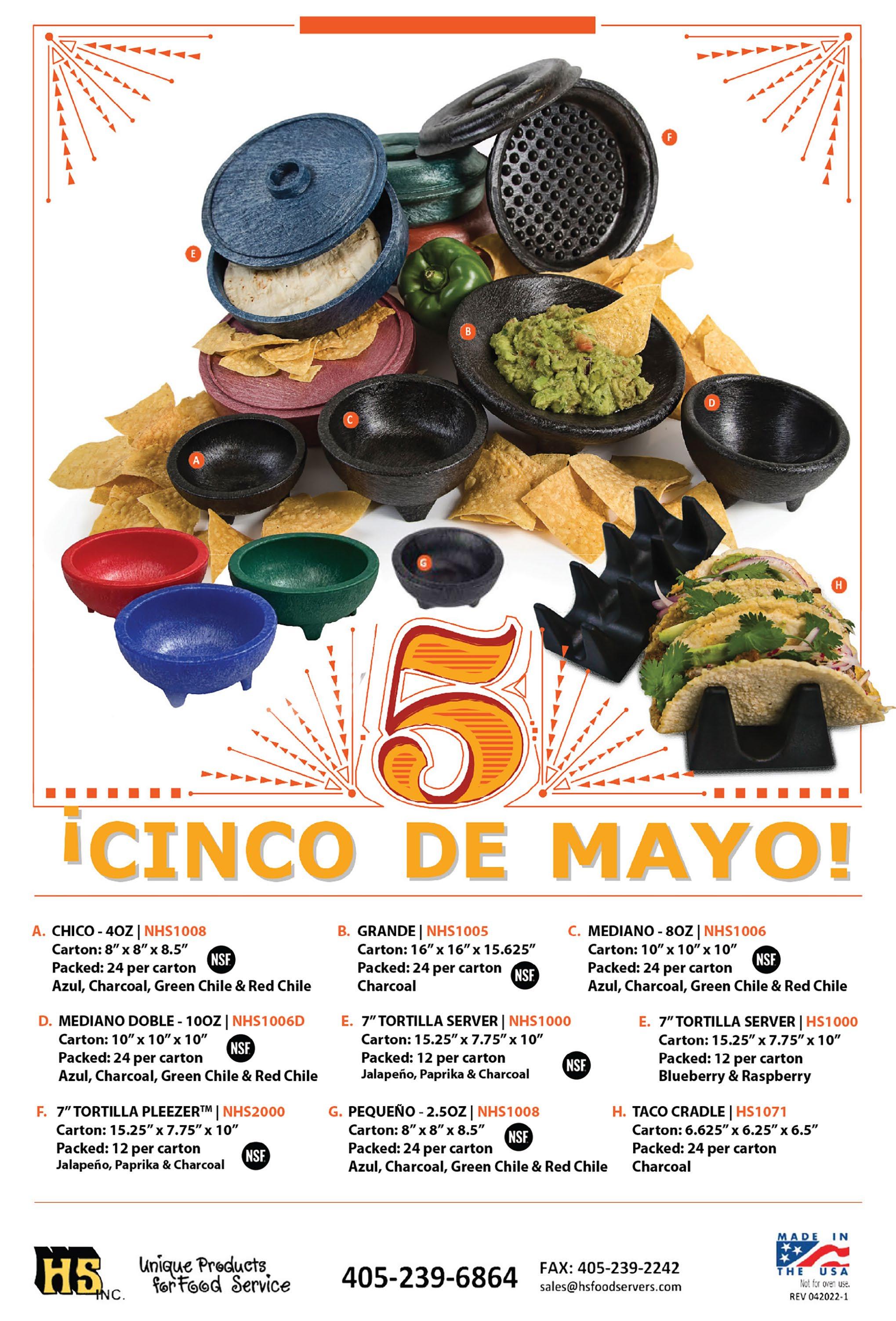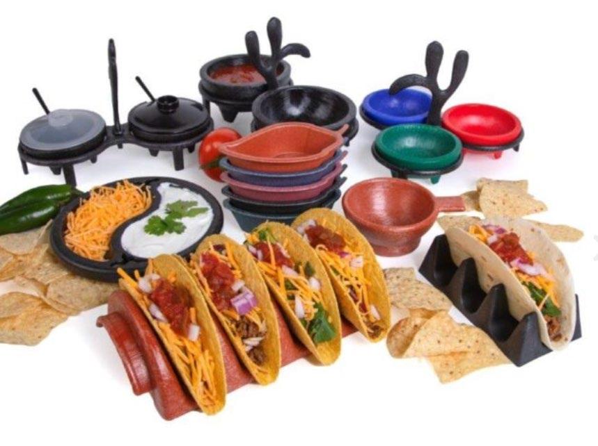 HS, Inc. The company’s line of serving ware is perfect for Mexican restaurants! Products include molcajetes; thermally insulated tortilla servers, and the new Tortilla PleezerTM that combines the thermal qualities and durability of the original server with the added benefit of patented elevators that keep the tortillas slightly raised; taco cradles that hold 3 tacos to keep them separate from rice and beans on the plate; taco servers with 4 compartments, perfect for kitchen preparation; chip and salsa servers; and a cactus style salsa caddie. Custom colors, plus custom logos on the tortilla server are also available. 405-239-6864; sales@hsfoodservers.com; hsfoodservers.com