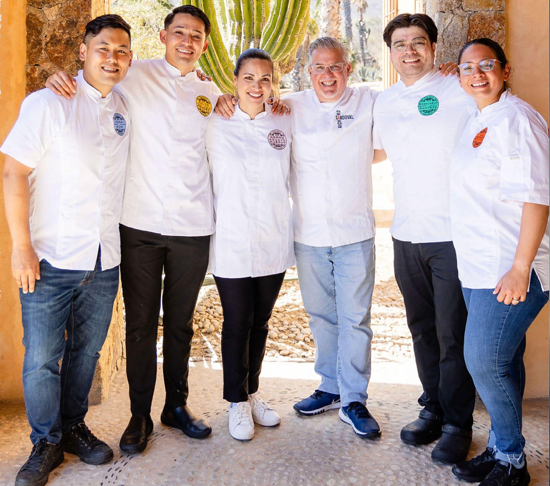 Chef Richard Sandoval (center) with the Old Ways, News Hands 2024 cohort (l to r): Jona Won, Julio Mendez, Gemma Aguayo-Murphy, Giancarlo Ramirez, Mely Hernandez de la Vega