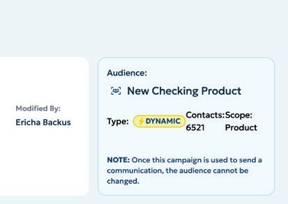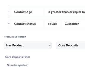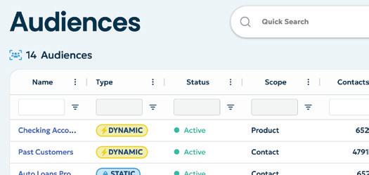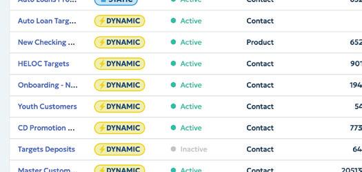 Use core account holder data to build targeted audiences based on product adoption, account details, and more.