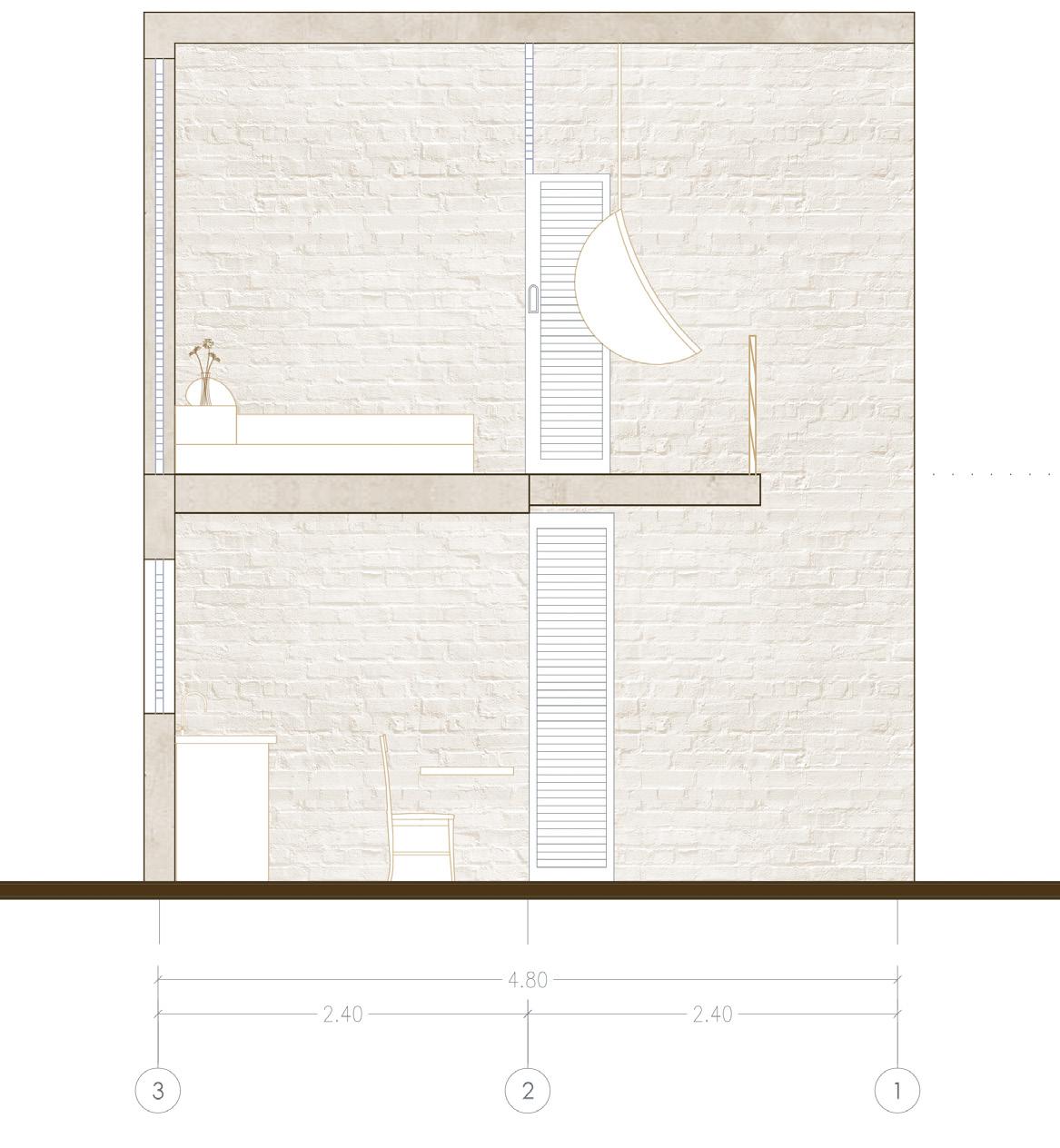 The private space is designed to be distinct from the social area and is located on a separate floor. It features a small workspace and folding doors that open up to a balcony.