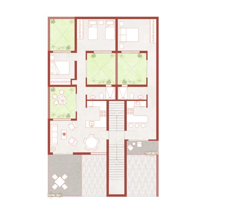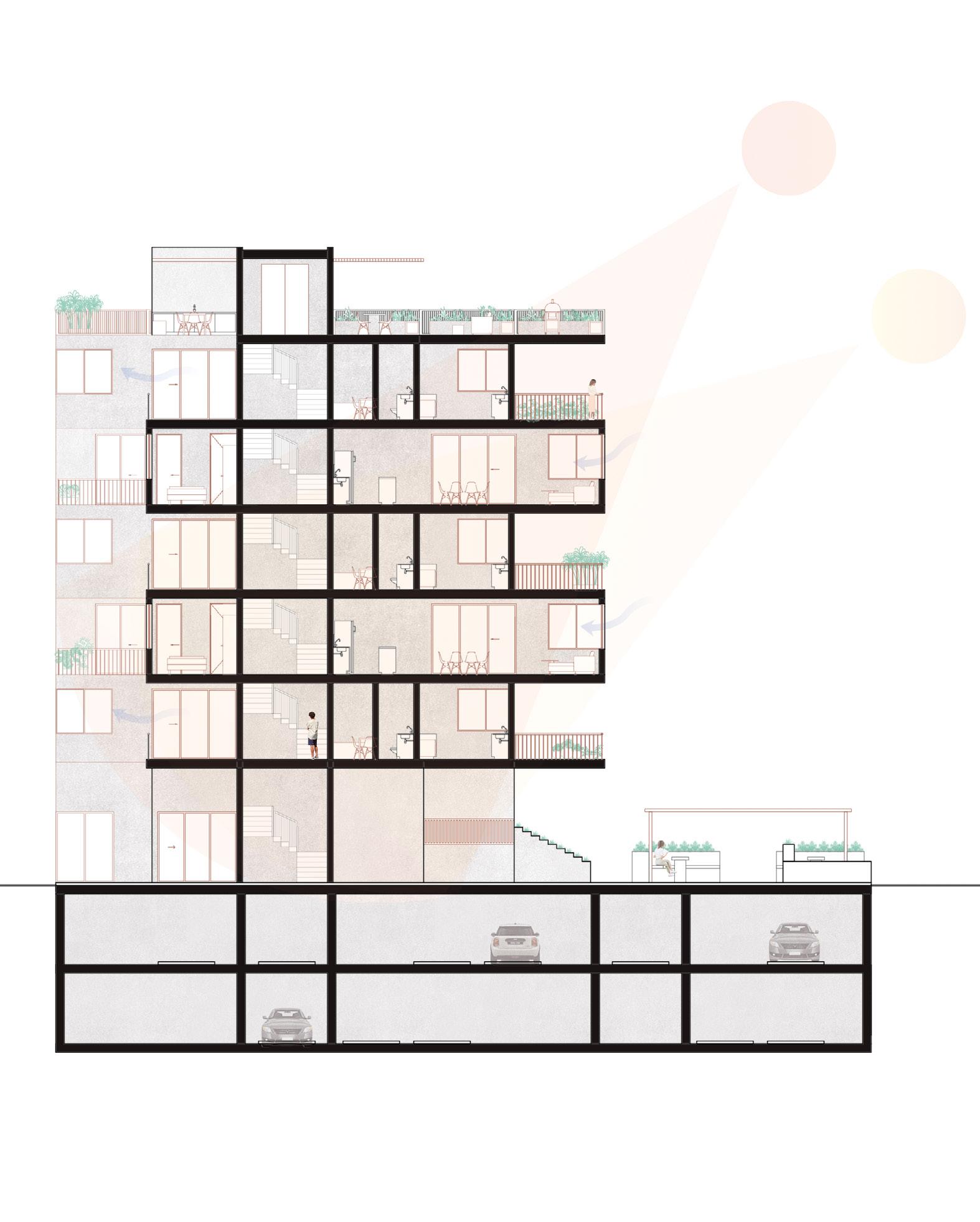 The design of the building places a strong emphasis on outdoor spaces that serve both recreational & cohabitational purposes of both public and private areas of the building.