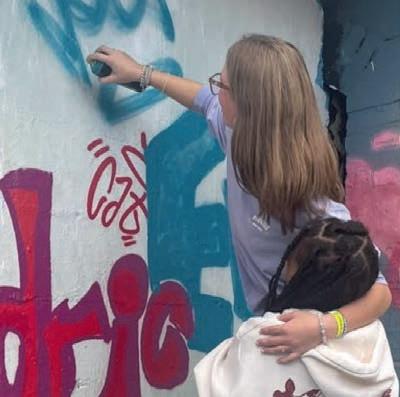 Une fresque murale a été réalisée par l’artiste graffeur Simba, en collaboration avec les enfants, au fond de la cour.