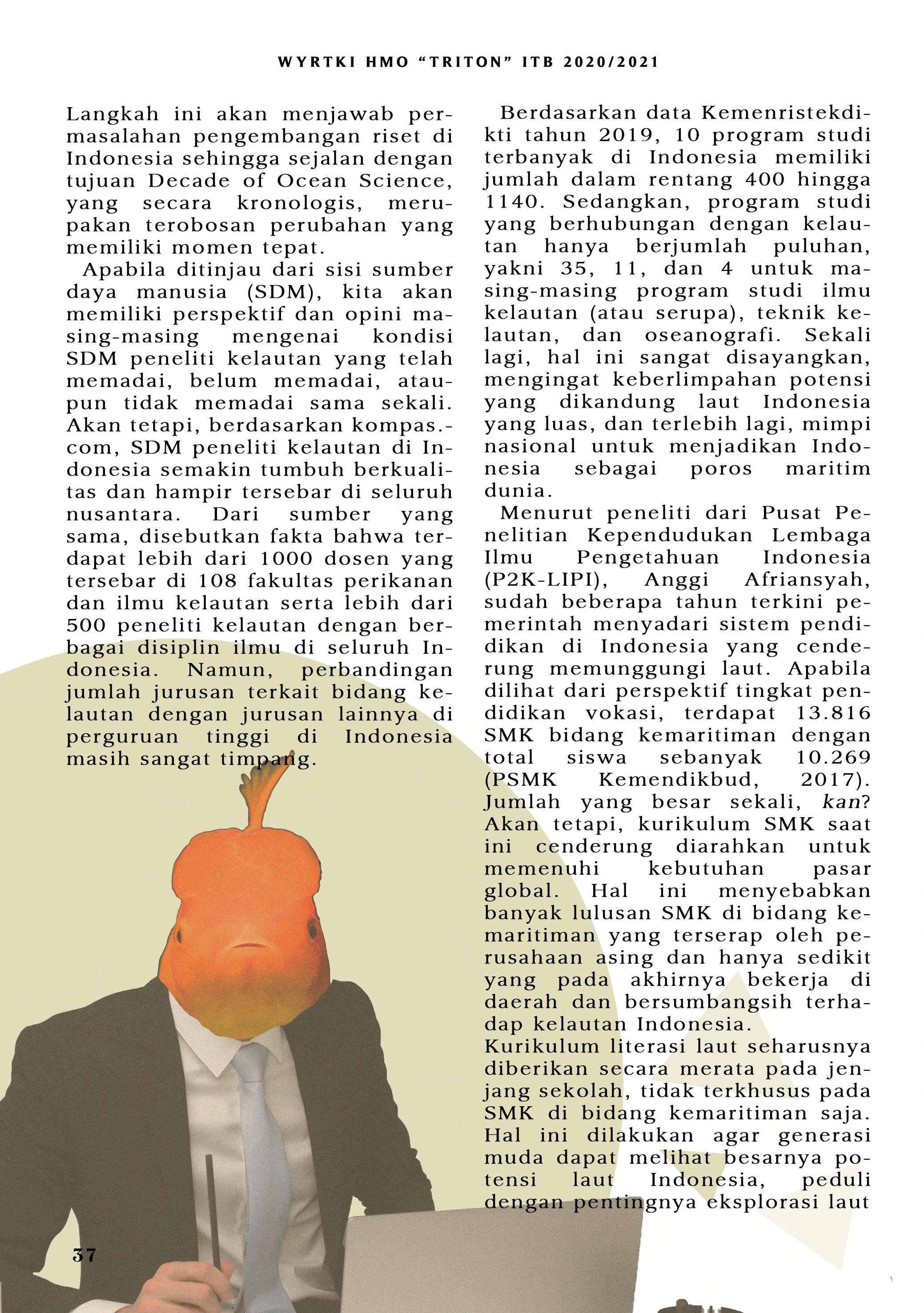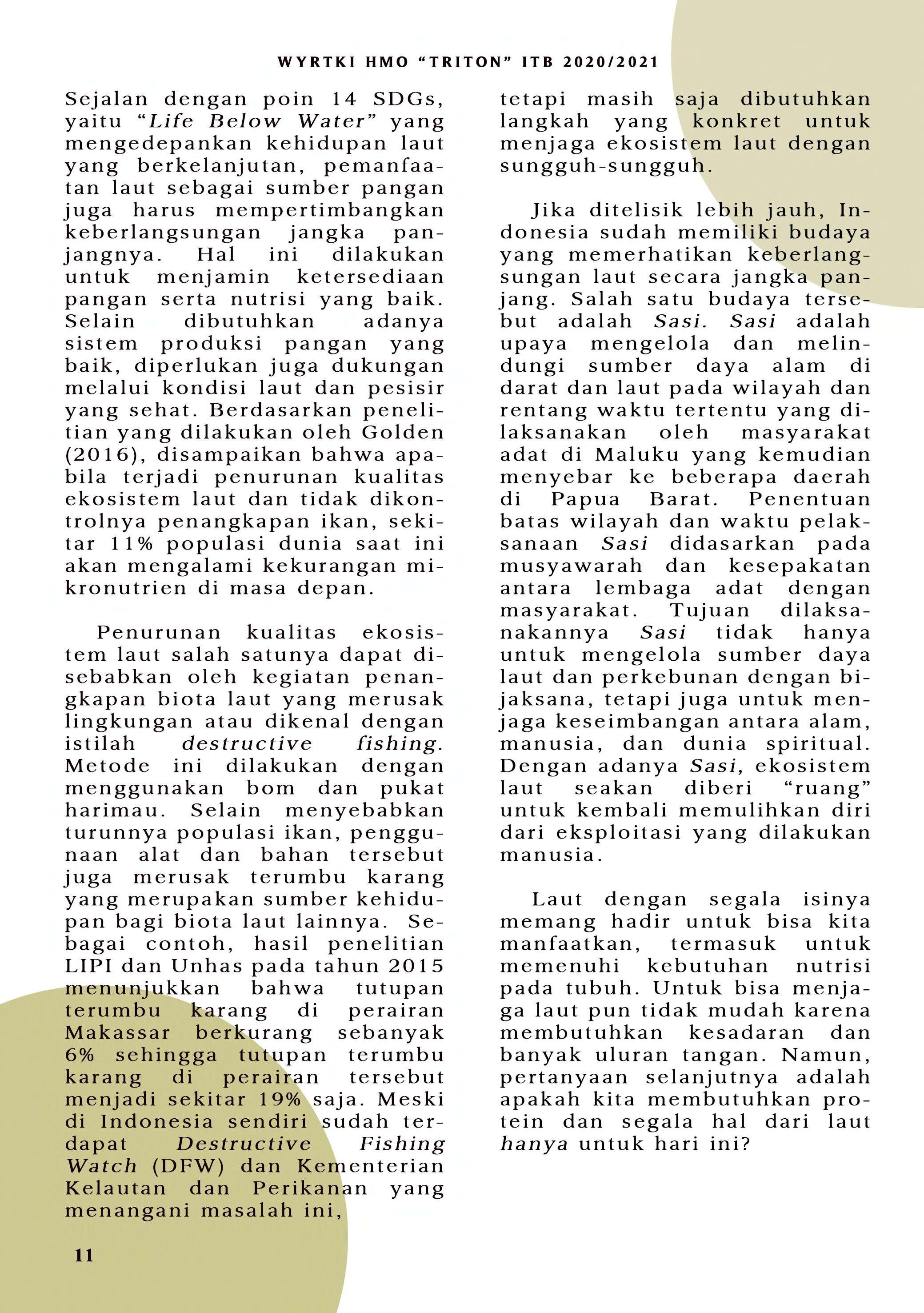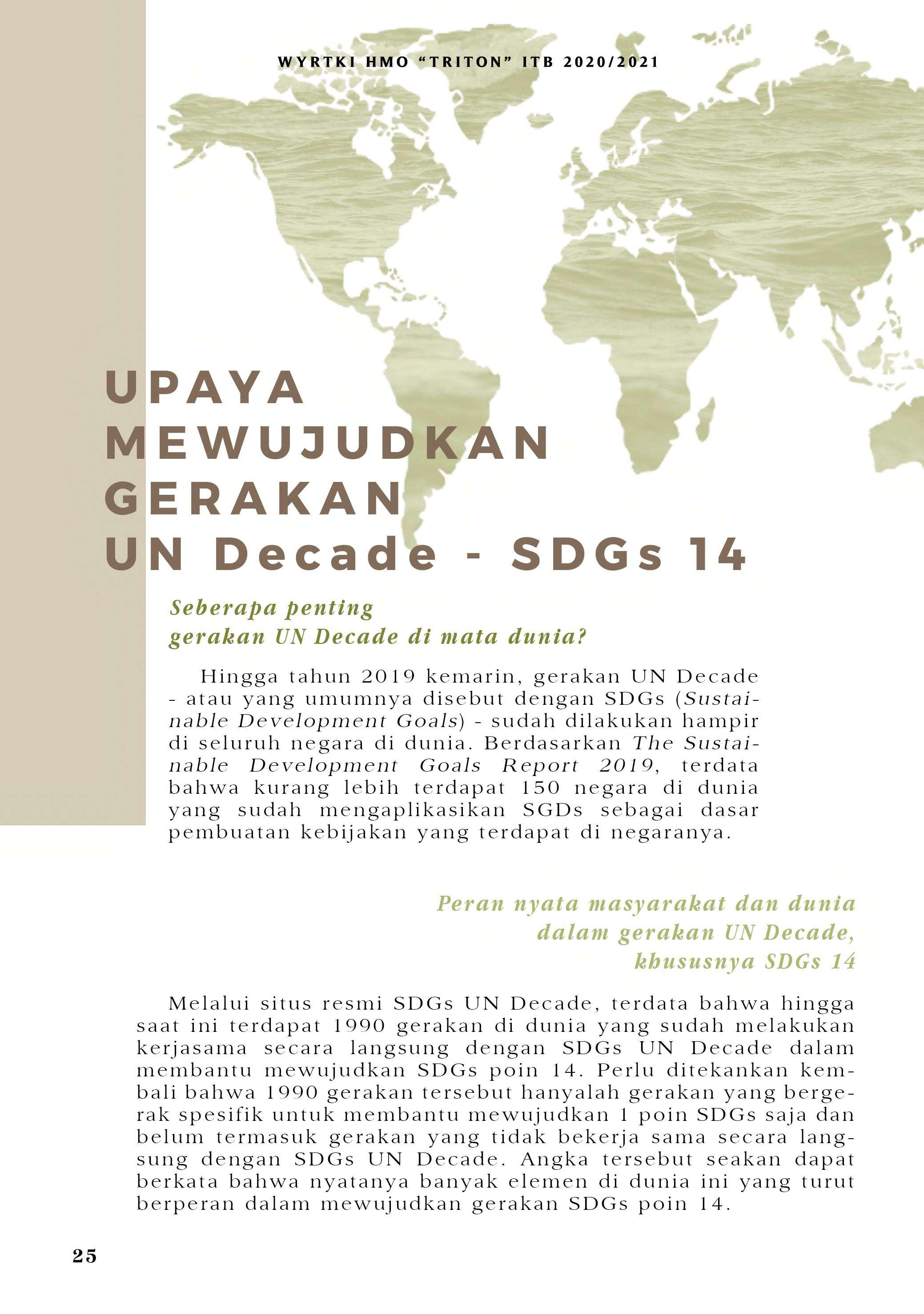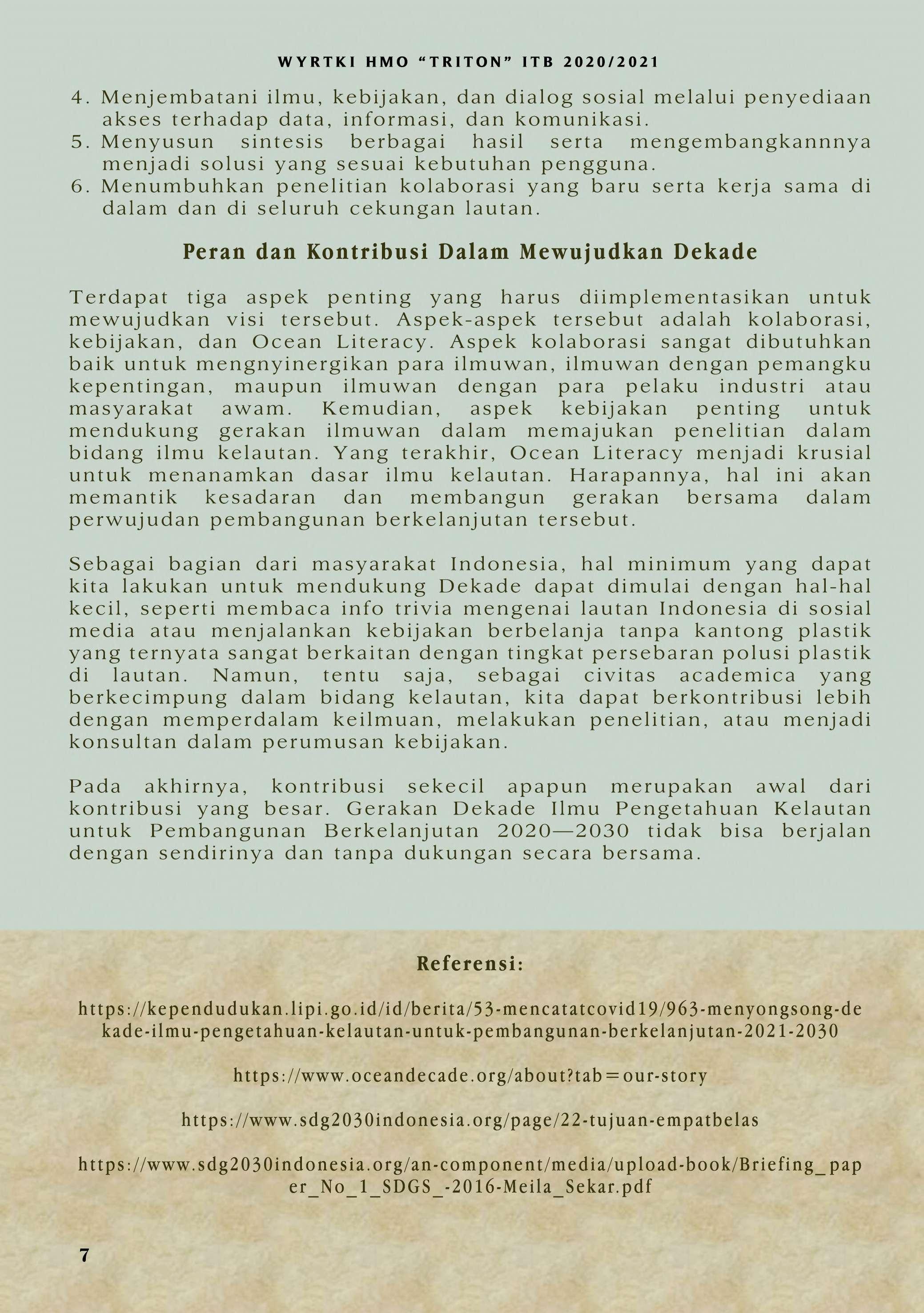 Bila di edisi sebelumnya mengupas mengenai SDG No. 14, HMO "TRITON" ITB pada tahun ini menerbitkan WYRTKI dengan tema "Dekade Ilmu Kelautan untuk Pembangunan Berkelanjutan 2021-2030". Tema ini diambil dari gerakan yang digagas oleh PBB. Untuk menunjang terwujudnya gerakan tersebut, WYRTKI 2020/2021 membahas dari segi kolaborasi, kebijakan, serta Ocean LIteracy. Selamat membaca!