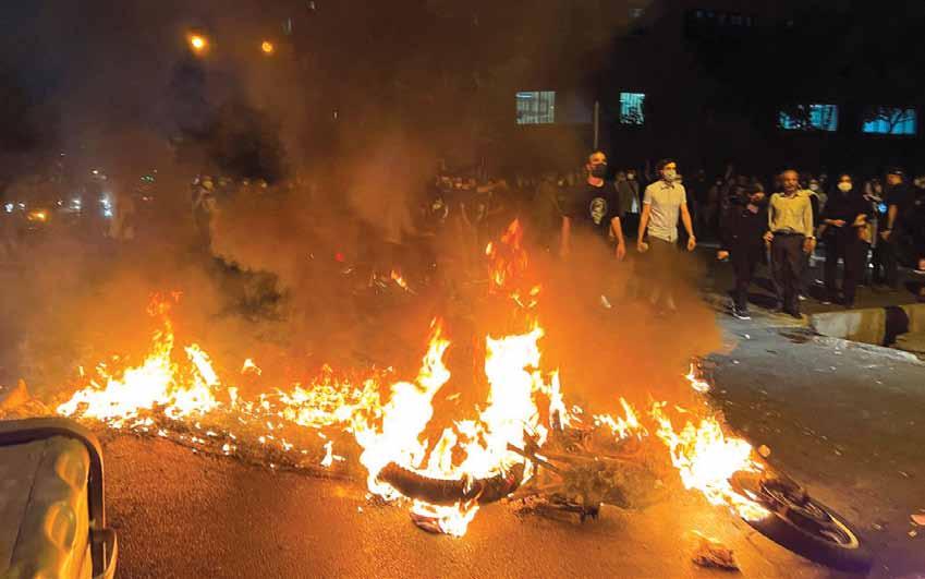A police motorcycle burns during a protest over the death of Mahsa Amini, a woman who died after being arrested by the Islamic republic›s «moral ity police», in Tehran, Iran September 19, 2022. WANA (West Asia News Agency) via REUTERS