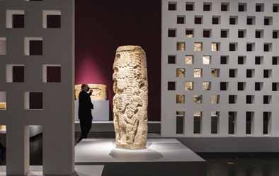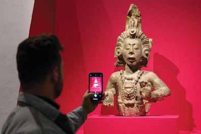 People look at a Mayan sculpture during the press preview of “Lives of the Gods: Divinity in Maya Art” at The Metropolitan Museum of Art in New York City on November 14, 2022. - The exhibition, which is set to open on November 21, 2022, features nearly 100 masterpieces, includ ing rare loans from Mexico and Guatemala that honor divine figures of the ancient Americas. / AFP