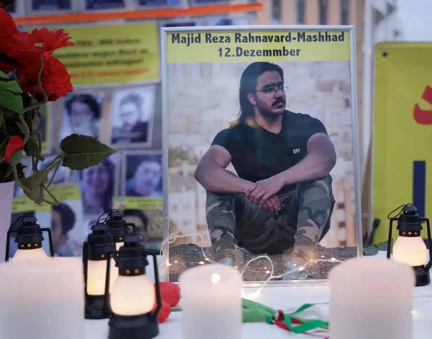 The brutes of the Islamic Republic attacked Majidreza Rahnavard’s grandmother’s residence, arresting his uncle and brother for a few hours.A photograph of Majid Reza Rahnavard stands on a table among candles during a demonstration by supporters of the National Council of Resistance of Iran outside the German Foreign Ministry in Berlin, Germany. Credit: GETTY