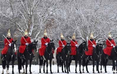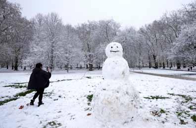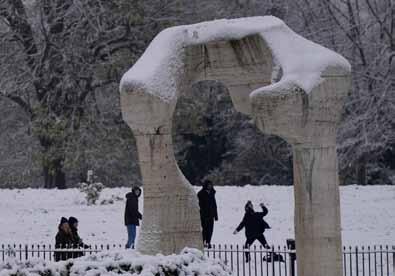 People enjoy the snow at Parliament Square in London, Monday, Dec. 12, 2022. Snow and ice have swept across parts of the UK, with cold wintry conditions set to continue for days. /AP