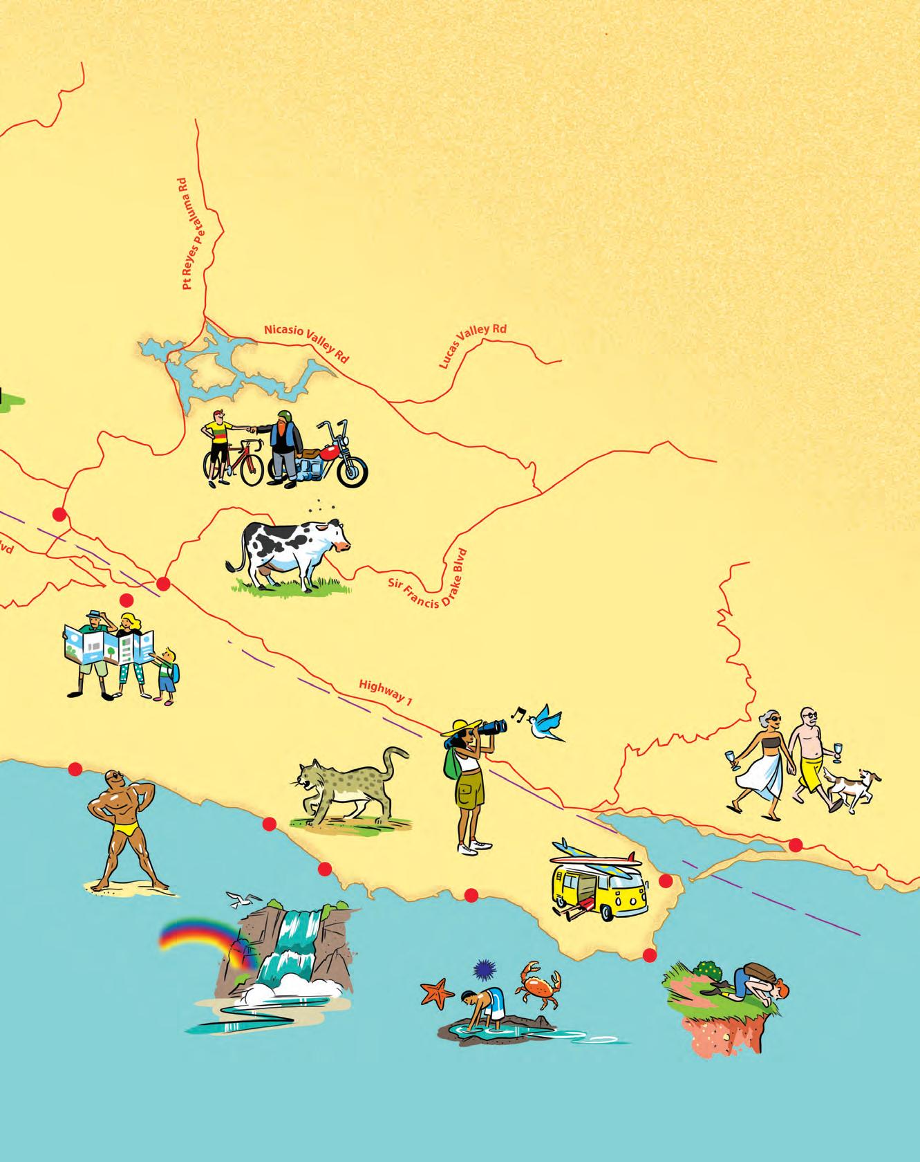 Welcome to one of the most geographically distinct, culinarily expressive and recreationally equipped places on the planet — Point Reyes. To get your summer going we’ve created this map with a mini bucket list of activi ties and places to visit. Start by strolling the notably long (2.5-mile) Stinson Beach — half of it dog friendly — or by sur fing or SUPing at Bolinas, or checking out the tide pools at Agate. Speaking of beaches, be sure to hit all of them, designated here by red dots along the coastline. A world-renowned biking destination, Point Reyes Station, with its varied eateries, is the ultimate refueling spot, so come hungry. Gastronomical adventures abound — oysters, cheese, wine, bread — if you crave it, it’s here. And to work it off, there are miles of trails, not to mention the hundreds of craggy steps, usually shrouded in fog, to the picturesque Point Reyes Lighthouse. Sea-lovers will find gorgeous waters, which sometimes even glow with bioluminescence. Unearth seriously cool native and radio history at the Marconi Conference Center and stations, and stand on what is widely regarded as Sir Francis Drake’s landing site, Drakes Beach. At the county’s northernmost point, Dillon Beach has lots of new attractions — restaurants, lodging and a beautiful swath of sand.