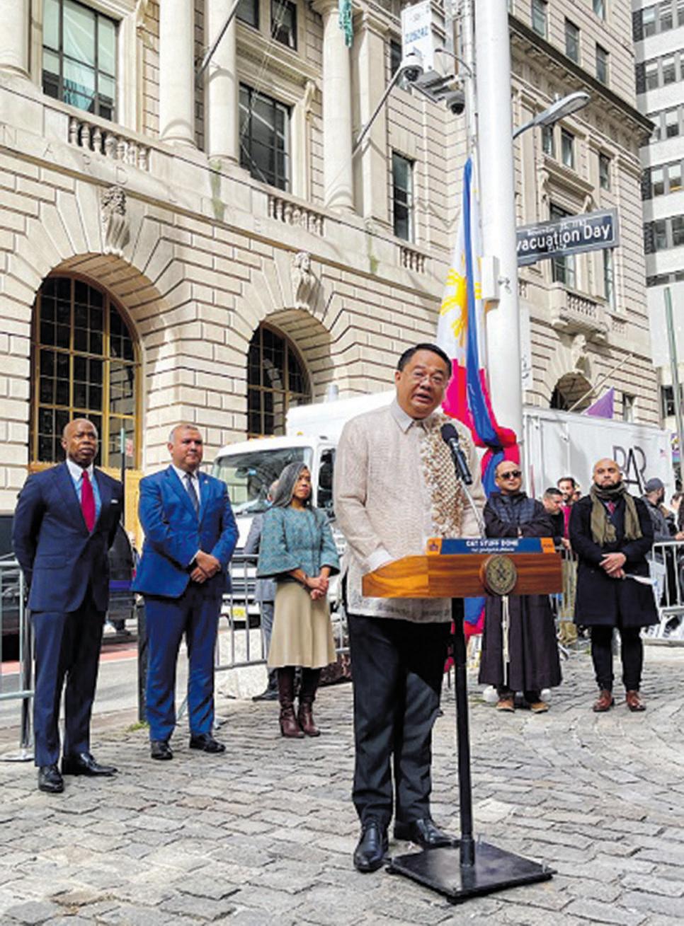 The Philippine flag is raised in Bowling Green, Manhattan to commemorate Filipino American History Month in New York. Cato delivers his remarks with Mayor Eric Adams and Filipina Deputy Mayor for Economic and Workforce Development Maria TorresSpringer in attendance. Facebook photo