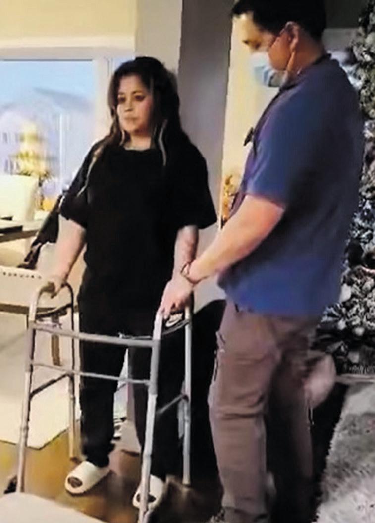 A short video shows Angel’s progress carefully navigating the few steps around her living room with a cane and a walker.