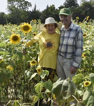 Ketty Lippi and Donald Westergom standing along a row of sunflowers.