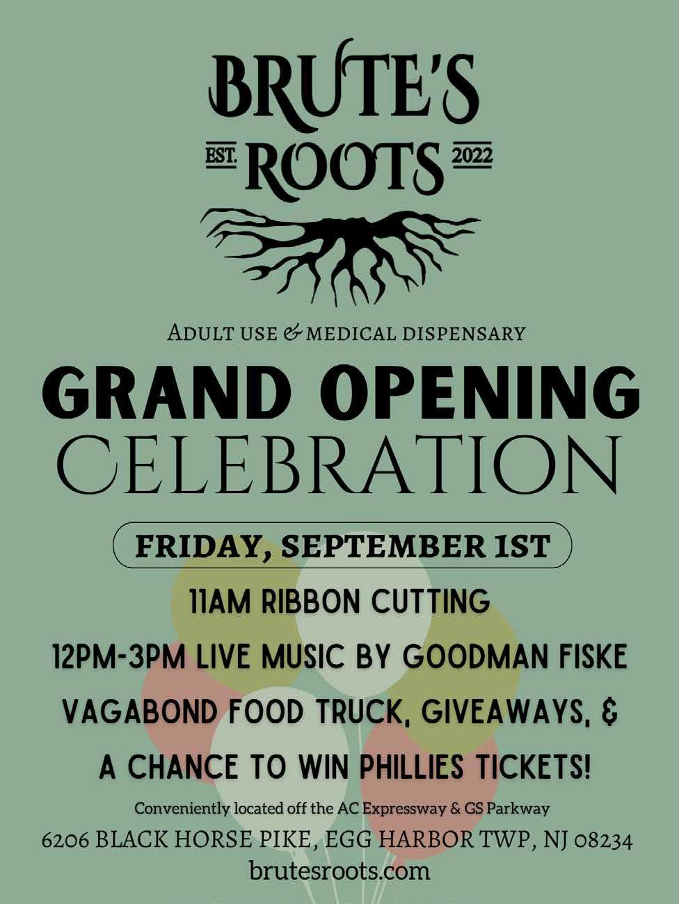 t he Friday grand opening will include a ribbon cutting, live music by g oodman Fiske, giveaways, a chance to win Phillies tickets, food from Vagabond, and more. stop by 6206 Black Horse Pike in Egg Harbor township beginning at 11 a.m. to meet the team and learn more about Brute’s Roots.