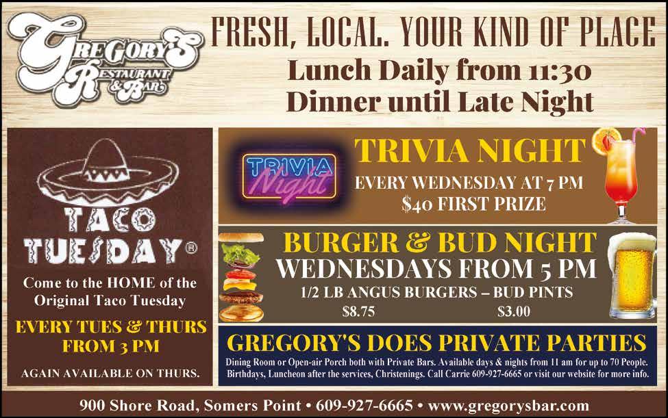 The Gateway Playhouse 738 Bay Avenue Somers Point 609.653.0553 www.gatewaybythebay.org Green Thumb Garden Club of Somers Point 516 West New York Ave Somers Point 609.204.4107 rosemaryevans@verizon.net Bayfest Saturday, April 27 | 10am-5pm Somers Point New Jersey's biggest outdoor festival, featuring food, crafters, and entertainment all along Bay Ave. The Somers Point Unique Experiences Club presenting: An Evening in Paris Gregory’s Restaurant May 2 www.spunique.weebly.com The South Jersey Jazz Society Somers Point Hosting spring series "Something Borrowed, Something Blue, and Something Neu" June 7 southjerseyjazz.org EXPERIENCE LOCAL! Somers Point Business Association Proudly Supports Our Community www.somerspointba.org 11 April 25, 2024