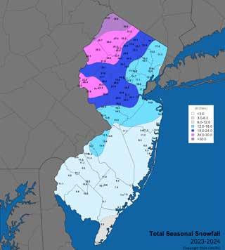 New Jersey 2023-2024 winter snowfall was higher than 2022-2023, however it remained below average for the South Jersey shore (Office of the New Jersey State Climatologist).