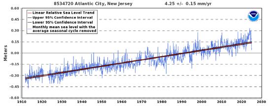 Below is a summary of what the Coastal risk Finder shows for the present and future of the Jersey Shore, as well as how to use the tool. All of the data is based on an intermediate sea level rise scenario. This scenario lines up best with the options presented by Climate Central, in comparison with what has happened historically in Atlantic City, our primary Jersey Shore tidal location.