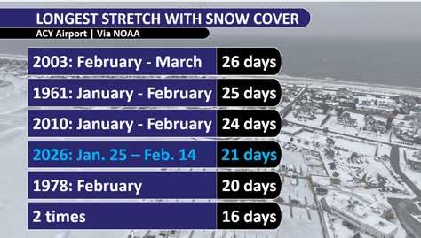 Atlantic City International Airport went 21 days in a row with at least an inch of snow or more on the ground. That's the fourth longest since records began in 1945. The last time it was longer than that was 24 days in 2010.