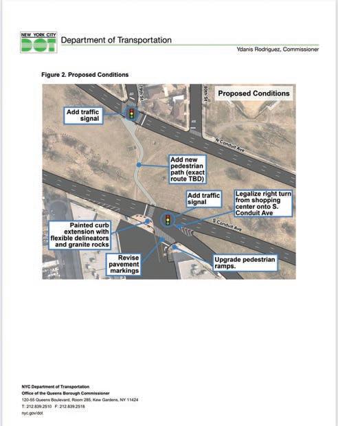 “As part of the safety improvements, the agency plans to install a tra c signal on both sides of Conduit Avenue,” the Queens commissioner wrote. “ is tra c signal will create a safer and more comfortable connection for pedestrians crossing Conduit Avenue.”