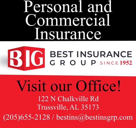 190 Main Street Trussville, AL 35173 (205) 533-8664 Scott Buttram, Publisher publisher@trussvilletribune.com Crystal McGough, Editor news@trussvilletribune.com Johnny Sanders, Sports Editor news@trussvilletribune.com Jana Mathews, Finance Manager Leigh Hays, Director of Sales & Marketing SALES STAFF Butch Cole Jason Anderson Member of the Alabama Press Association Monda 41 y - Friday 8am-5pm Saturday 8am-12pm Closed Sunday Latest