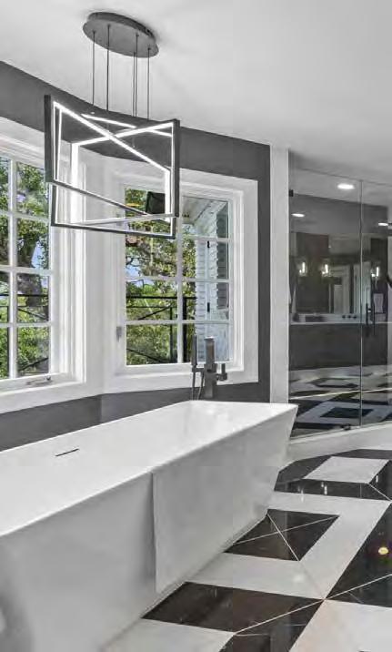 Above the deep plunge tub, a sculptural light fixture casts a gentle glow, drawing your eye toward a view of downtown Tampa in the distance. The tub itself invites you to slow down, to sink in and let the noise of the day fade into the background.