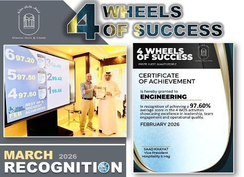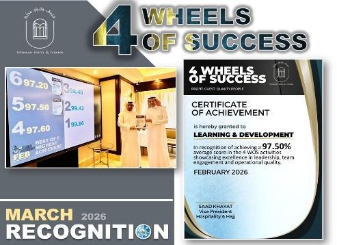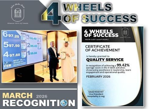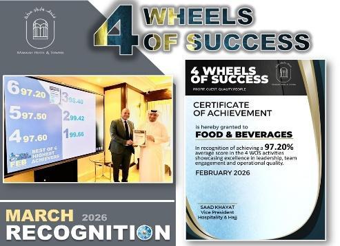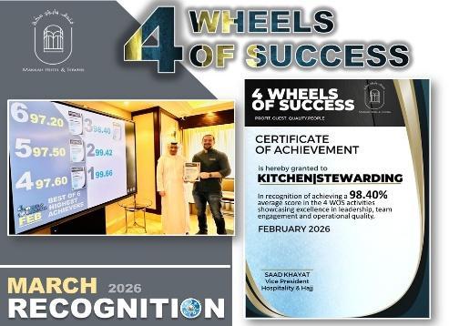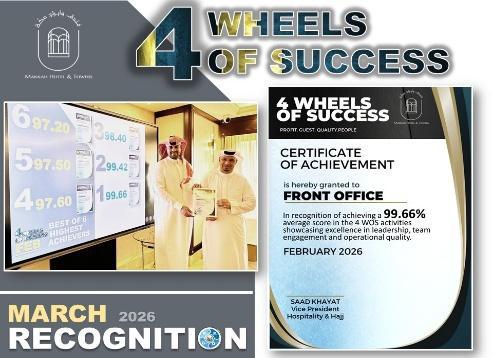 The Guest Experience and Quality Team proudly celebrated remarkable achievements during this period, reflecting their continuous dedication to excellence and high performance standards. The team achieved outstanding results in the 4 Wheels of Success (4 WOS) initiative, reaching an impressive 98% score, which highlights their strong commitment to quality service, teamwork, and operational excellence.