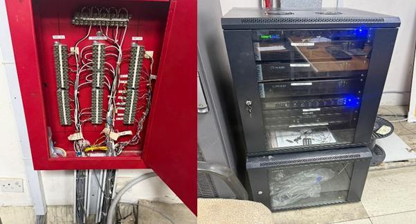 The cabling network was then routed upward to the first floor, where it was connected directly to the STC room This connection served as a critical link between the distributed speaker system and the central control infrastructure Finally, the system was extended to the control room, where it was integrated with the main amplifier, enabling centralized audio management and distribution