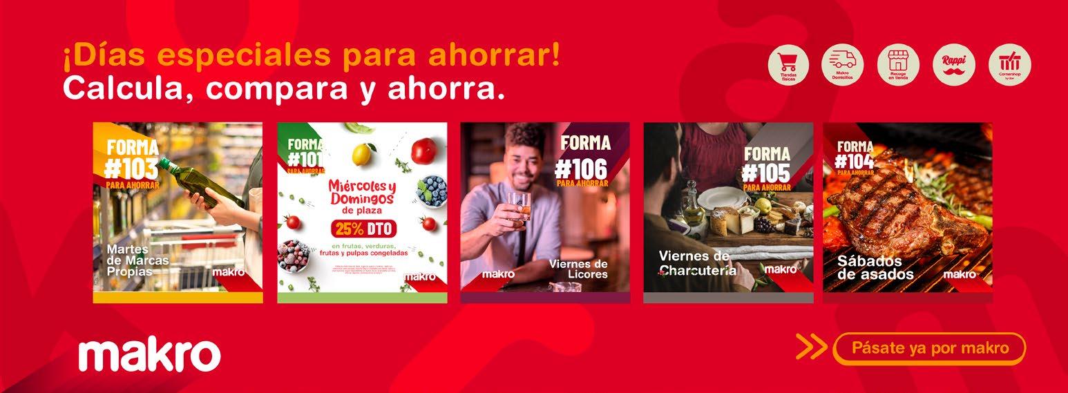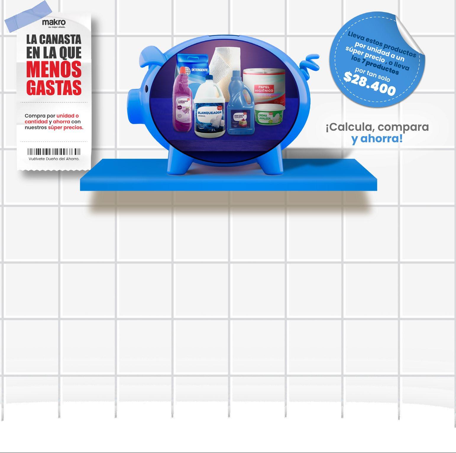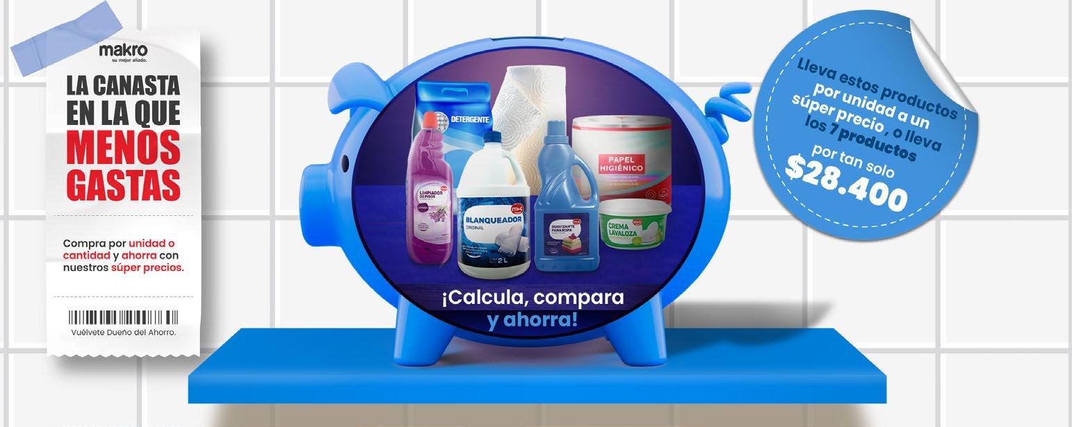 Súper ofertas Ofertas válidas del 9 al 15 de febrero de 2024 o hasta agotar existencias. MakroColombia: 3 Ofertas para ahorrar comprando MÁS DE 1 UNIDAD Lavaloza Líquido Aro Neutro x 5 Lt Acqua Postobón Manzana x 1500 ml Jabón en Barra Dove White 12 Und x 90 g Masmelos Cubiertos Chocmelos 280 g en 10 Und CÓD. 40860 / 150 UND* CÓD. 145715 / 150 UND* CÓD. 737035 / 150 UND* CÓD. 139276 / 150 UND* MA YO RI ST A REGU LA R $26.220 $27.600 P.U.M. 5,52 $/ml P.U.M. 5,25 $/ml Comprando 1 Und A partir de 3 Unds MA YO RI ST A REGU LA R $3.600 $3.800 P.U.M. 2,54 $/ml P.U.M. 2,4 $/ml Comprando 1 Und A partir de 4 Unds MA YO RI ST A REGU LA R $49.300 $51.900 P.U.M. 4.325 $/Und P.U.M. 4.109 $/Und Comprando 1 Und A partir de 2 Unds MA YO RI ST A REGU LA R $18.700 $19.400 P.U.M. 1.940 $/Und P.U.M. 1.870 $/Und Comprando 1 Und A partir de 2 Unds Agua Brisa Pet x 600 ml Agua Cristal Pet x 3.125 Lt Mermelada Mora La Constancia x 200 g CÓD. 112956 / 150 UND* CÓD. 114226 / 150 UND* CÓD. 126398 / 150 UND* MA YO RI ST A REGU LA R $1.000 $1.200 P.U.M. 2 $/ml P.U.M. 1,67 $/ml Comprando 1 Und A partir de 3 Unds MA YO RI ST A REGU LA R $3.400 $3.600 P.U.M. 1,16 $/ml P.U.M. 1,09 $/ml Comprando 1 Und A partir de 2 Unds MA YO RI ST A REGU LA R $4.500 $4.650 P.U.M. 23,25 $/g P.U.M. 22,5 $/g Comprando 1 Und A partir de 2 Unds Detergente en Polvo Rindex 10 Suavizante x 2 Kg CÓD. 122540 / 150 UND* MA YO RI ST A REGU LA R $22.700 $23.900 P.U.M. 11,95 $/g P.U.M. 11,35 $/g Comprando 1 Und A partir de 3 Unds