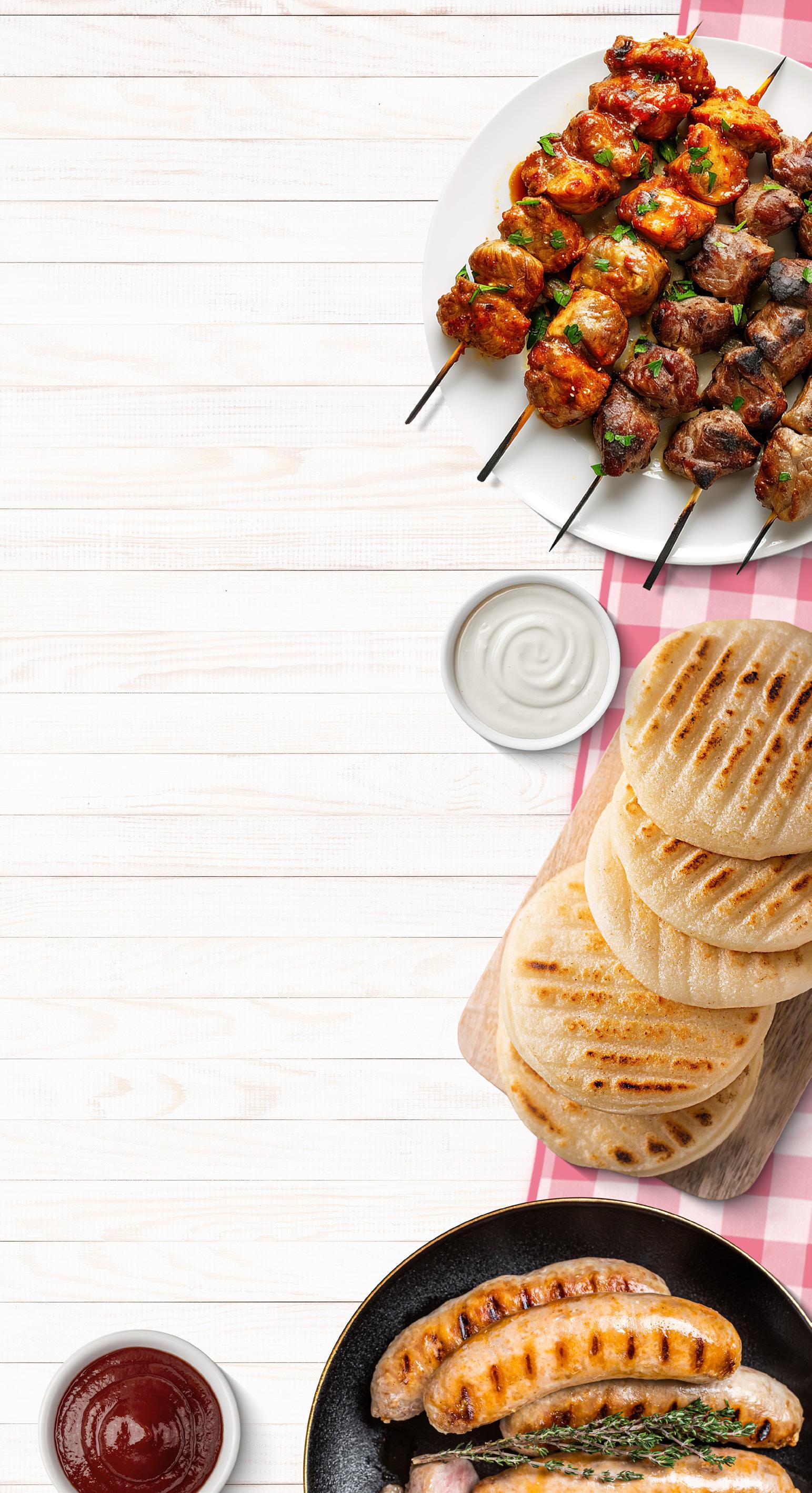 Sirve la carne asada junto con las arepas, los chorizos y los pinchos de pollo Acompaña todo con el té en polvo sabor lychee y albaricoque y disfruta una bebida muy refrescante.