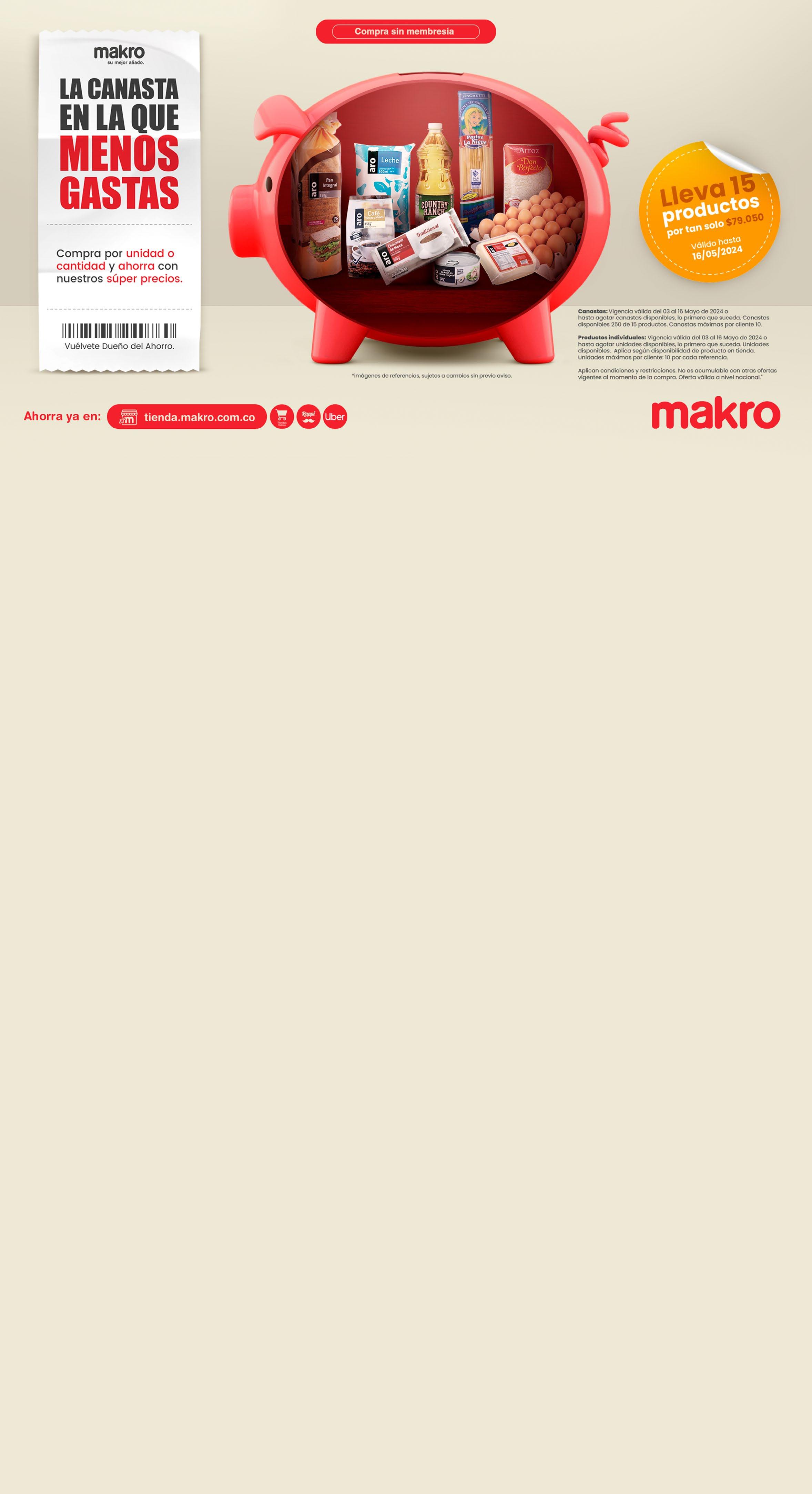 Ofertas válidas del 10 al 16 de mayo de 2024 o hasta agotar existencias. MakroColombia Solicita ya tus Tarjetas Banco Falabella Conoce más en Bancofalabella.com Úsalas para todas tus compras, acumula CMR Puntos y canjéalos por diferentes productos en Makro Excepto para tiendas Av Boyacá, Santa Marta, Montería, Estación Poblado, Cajicá, Puente Aranda y Alto Prado. Sujeto a disponibilidad en tienda Lubricantes Automotriz Referencias Seleccionadas 10 Código / UND* Descripción Precio Regular Precio Oferta 138365 / 800 UND* -P.U.M. 91,6 $/ml Lubricante Wd-40 Multipropósito 382 ml $ 38.900 $ 35.010 141018 / 800 UND* -P.U.M. 132,67 $/ml Aceite En Aerosol 3-En-Uno Usos Multiples 135 ml $ 19.900 $ 17.910 138374 / 800 UND* -P.U.M. 98,7 $/ml Revitalizador de Panel Centralsul Brillo Seco Filtro Uv 300 g $ 32.900 $ 29.610 138371 / 800 UND* -P.U.M. 83,03 $/ml Silicona Brillo Seco Central Sulsurtida 400 ml $ 36.900 $ 33.210 138367 / 800 UND* -P.U.M. 79 $/ml Aceite 3-En-Uno Usos Multiples Gotero x 90 ml Referencia Seleccionada $ 7.900 $ 7.110 Delantales Home Set BBQ Drill CÓD. 157966-157967 / 100 UND* Excepto para tienda Alto Prado. Sujeto a disponibilidad en tienda Bayetillas Aro 36-60cm x 6 Und Blanca - Amarilla - Roja CÓD. 393133-587288-392340 / 300 UND* Excepto para tienda Alto Prado. Sujeto a disponibilidad en tienda $35.910 Precio Regular: $39.900 Precio Oferta 10 15 Alimento para Mascotas Cat Chow Alimento para Mascotas Dog Chow Excepto para tienda Alto Prado Excepto para tienda Alto Prado Código / UND* Descripción Precio Regular Precio Oferta 53442 / 1500 UND* -P.U.M. 22,73 $/g Vida Sana x 3 Kg $ 90.900 $ 68.170 797680 / 1500 UND* -P.U.M. 20,44 $/g Adulto Activo Carne Forti Defense x 1.5 Kg $ 40.900 $ 30.670 798018 / 1500 UND* -P.U.M. 20,95 $/g Adulto Activo Pescado Forti Defense x 1.5 Kg $ 41.900 $ 31.420 25 Código / UND* Descripción Precio Regular Precio Oferta 98343 / 2000 UND* -P.U.M. 12,93 $/g Cachorro Razas Pequeñas x 8 Kg $ 137.900 $ 103.420 344773 / 2000 UND* -P.U.M. 65,95 $/g Adulto Activo Carne Forti Defense x 1.5 Kg $ 131.900 $ 98.920 98460 / 2000 UND* -P.U.M. 13,21 $/g Edad Madura x 8 Kg $ 140.900 $ 105.670 98469 / 2000 UND* -P.U.M. 13,21 $/g Sano y en Forma x 8 Kg $ 140.900 $ 105.670 25 Portafolio de Moldes Press CÓD. 135017-135064-135073-135075-135078-135072-135074-135068-135063-13941 / 1000 UND* Aplica según disponibilidad en tienda 20